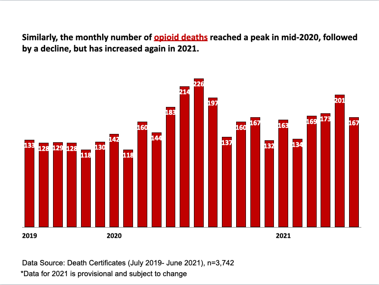 As of now, the peak in opioid overdoses and deaths appears to be mid-2020, though cases decreased after that only to rebound again, numbers from a PowerPoint by the Arizona Department of Health Services in September 2021 shows. Fentanyl and oxycodone were the most common drugs causing overdoses in the last two years.