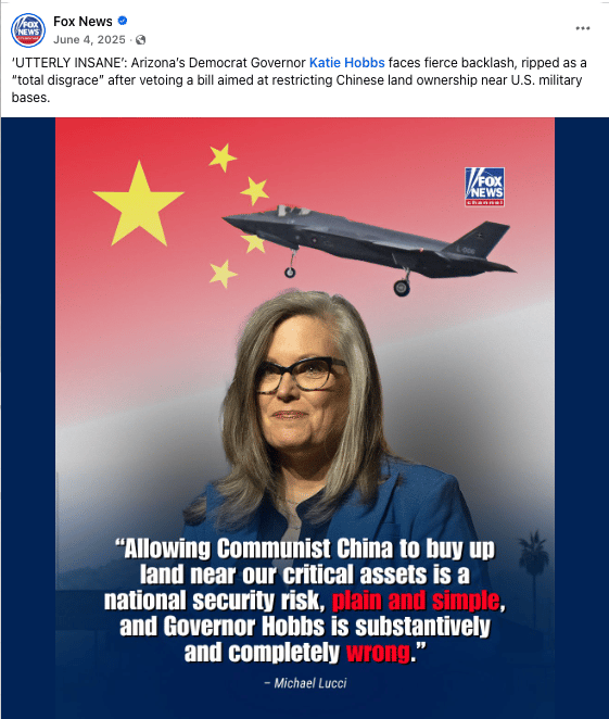 After last year's initial veto on the land ownership bill, right-wing outlets circulated stylized images of Hobbs superimposed over the Chinese flag. And Lucci told Fox News the veto “hangs an 'Open for the (Chinese Communist Party)' sign on Arizona’s front door.”