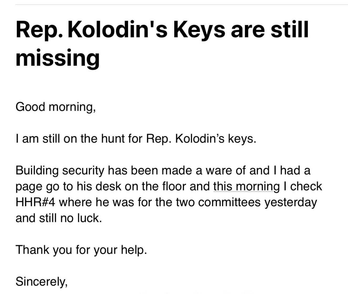 If you found Republican Rep. Alexander Kolodin’s keys somewhere around the state House of Representatives, he would like you to return them, please.