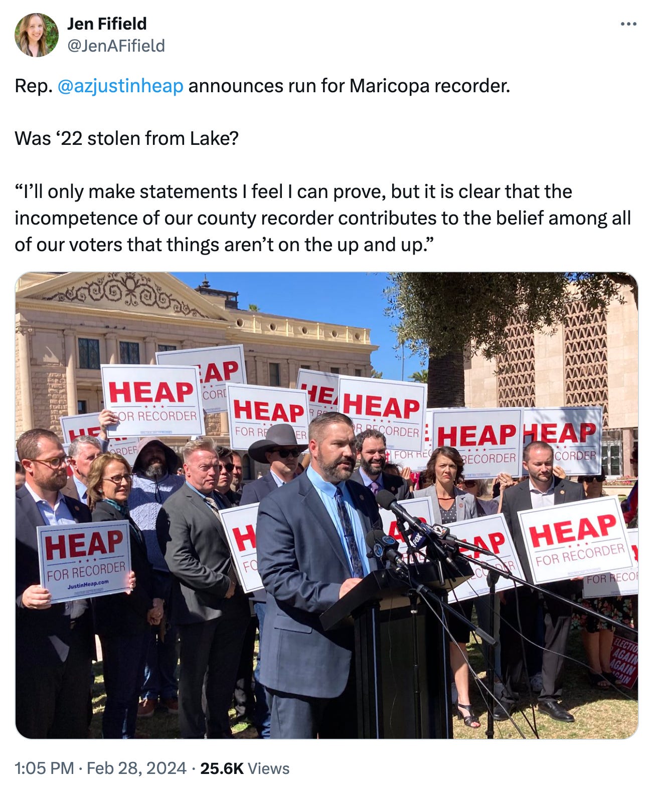 Called it: As we predicted on Monday, the MAGA movement’s much-hyped primary challenger to Republican Maricopa County Recorder Stephen Richer is Rep. Justin Heap, a freshman lawmaker and lawyer best known for his objectively funny Twitter feed (assuming he doesn’t block you) and his awkward attempt to extort a lobbyist for a donation during his first month in office. Heap announced his candidacy at a brief press conference at the Capitol yesterday while surrounded by members of the “freedom caucus.”