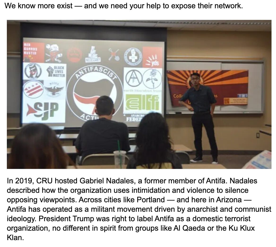 College Republicans United at ASU, last seen urging students to call the feds on classmates who they suspect are undocumented, is hosting a “Report your local ANTIFA to the Feds” event on Thursday.