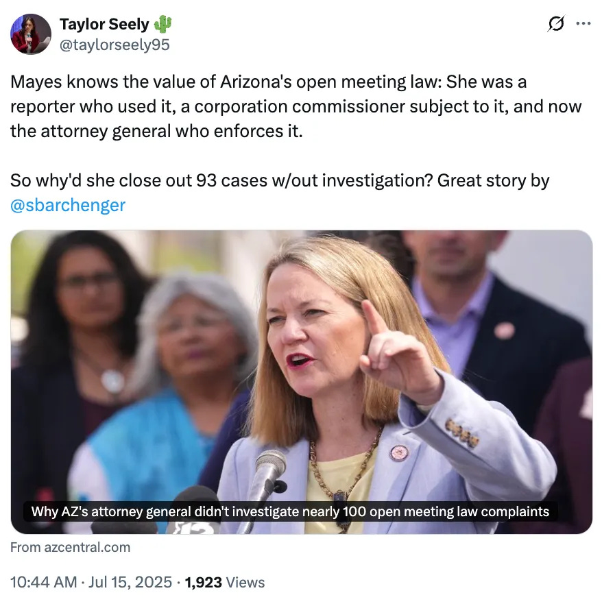 We also suggested he look into the laws around public non-disclosure agreements — à la Pima County’s Project Blue — since NDAs are innately connected with public meeting and executive session laws.