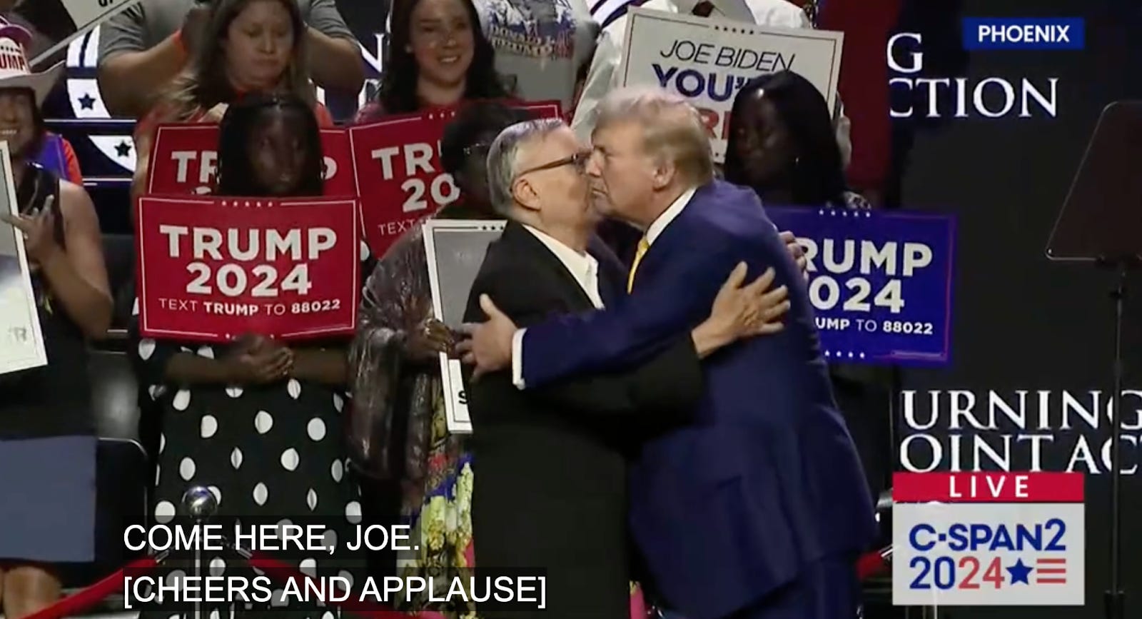 A welcome back kiss: Former president Donald Trump invited former Maricopa County Sheriff Joe Arpaio on stage for an awkward kiss during his stop in Phoenix yesterday. The 34-time convicted felon also endorsed Republican U.S. Rep. Debbie Lesko for her bid on the Maricopa County Board of Supervisors. The Republican supervisors refused to overturn the results of the 2020 election, but Lesko didn’t have the same reservations while voting as a member of Congress. Also, the school affiliated with Trump’s venue of choice, Dream City Chuch’s Christian School, received $900,000 in school voucher funds from July 2022 to June 2023, per the Republic’s Madeleine Parrish. The school collaborates with Turning Point USA to teach a curriculum void of “wokeism” and “radical LGBT agendas.” Finally, just in time for Trump’s visit, Sen. Jake Hoffman pleaded not guilty to felony charges tied to his role in the fake elector scheme to give the 2020 presidential win to Trump, Elena Santa Cruz and Stacey Barchenger report for the Republic.