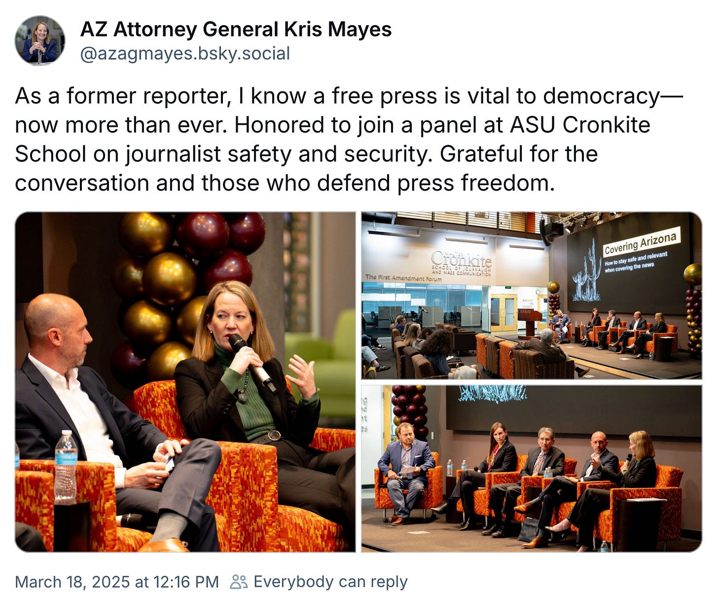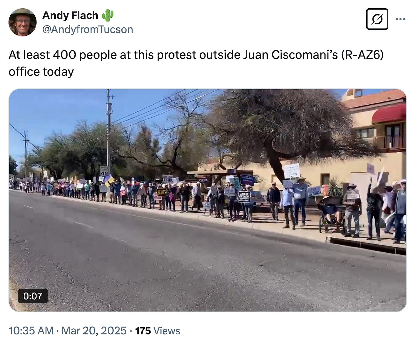 So much to unpack in that newsletter. I’m spitting mad (my mom used to say) at the Arizona Republicans at this point. They are so out of touch with the citizens of this state and it could be heard LOUD AND CLEAR as I waited for an hour and a half to get into Mullett arena to see AOC and Bernie. Didn’t make it. Needed a way, way bigger venue. There were thousands of people waiting that didn’t get in. (I attend lots of sporting events and can gauge attendance fairly well). People were patient, friendly and kind. I luckily found my grandson who got there before me. Many Utubed the speeches while waiting in line. Schweikert’s name disparaged. Old, young, families, people with walkers, broken legs, lots of great tshirts, all waited. Finally disappointed, got a bite to eat and off I went in my ride share. Matt Gress, be on notice. Stop trying to make political points when you look like a fool. Hobbs can’t even get her agency appointments. How’s she supposed to run the state? Have a great day!
