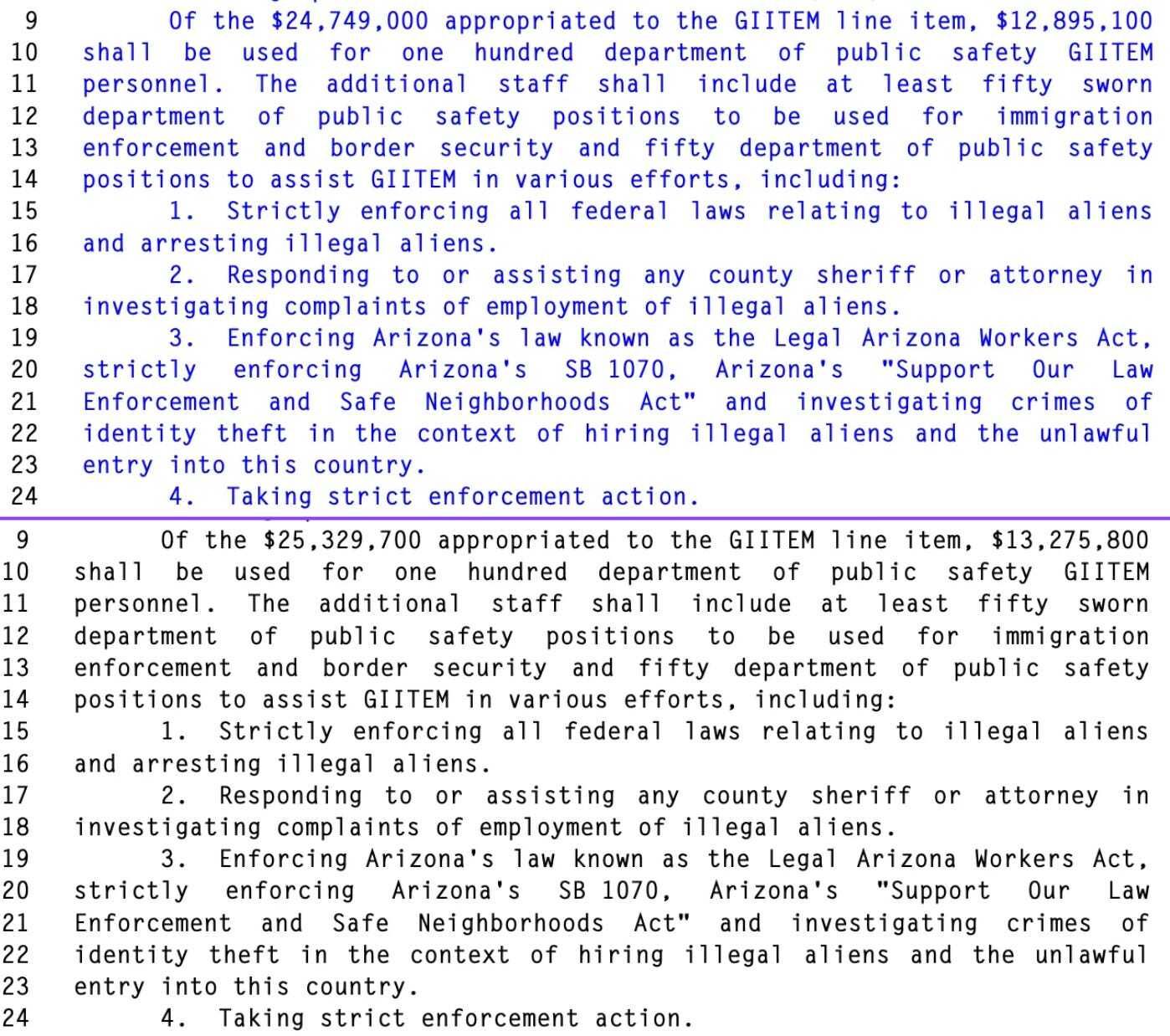However, every single budget she has ever voted for contained that exact same language. Sometimes with slightly more money to “enforce SB1070.”