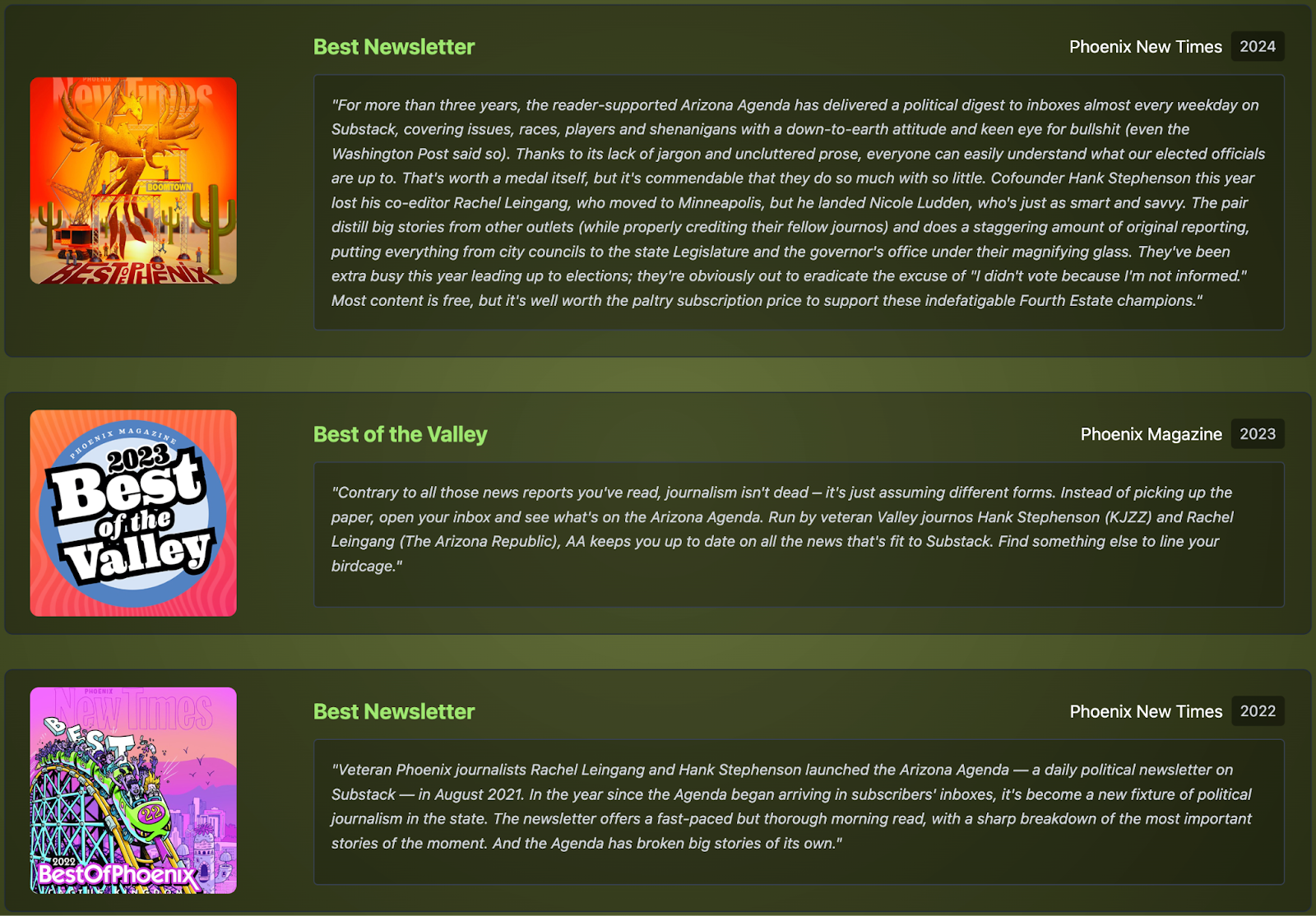 Besides winning the respect of our competition, our reporters have won a host of awards for their work here — including being named Arizona’s “journalist of the year” in two of the three full years that the Agenda has existed.