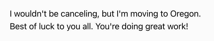 Sometimes people unsubscribe because we write something that pisses them off. That’s fair! More often, our unsubscribers leave notes saying they’re moving out of state or cutting back on expenses. Also fair.