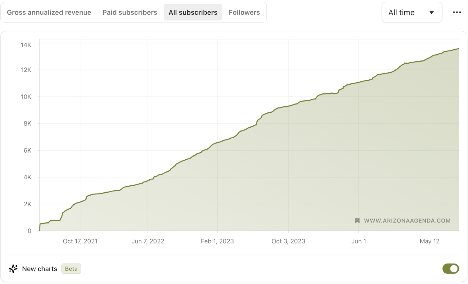 In the three-plus years2 that we’ve been doing this, we’ve been able to grow the Arizona Agenda and hire more journalists and build cool and exciting new news lanes, including with the Tucson Agenda, and our new weeklies, the Water Agenda, the A.I. Agenda and the Education Agenda.