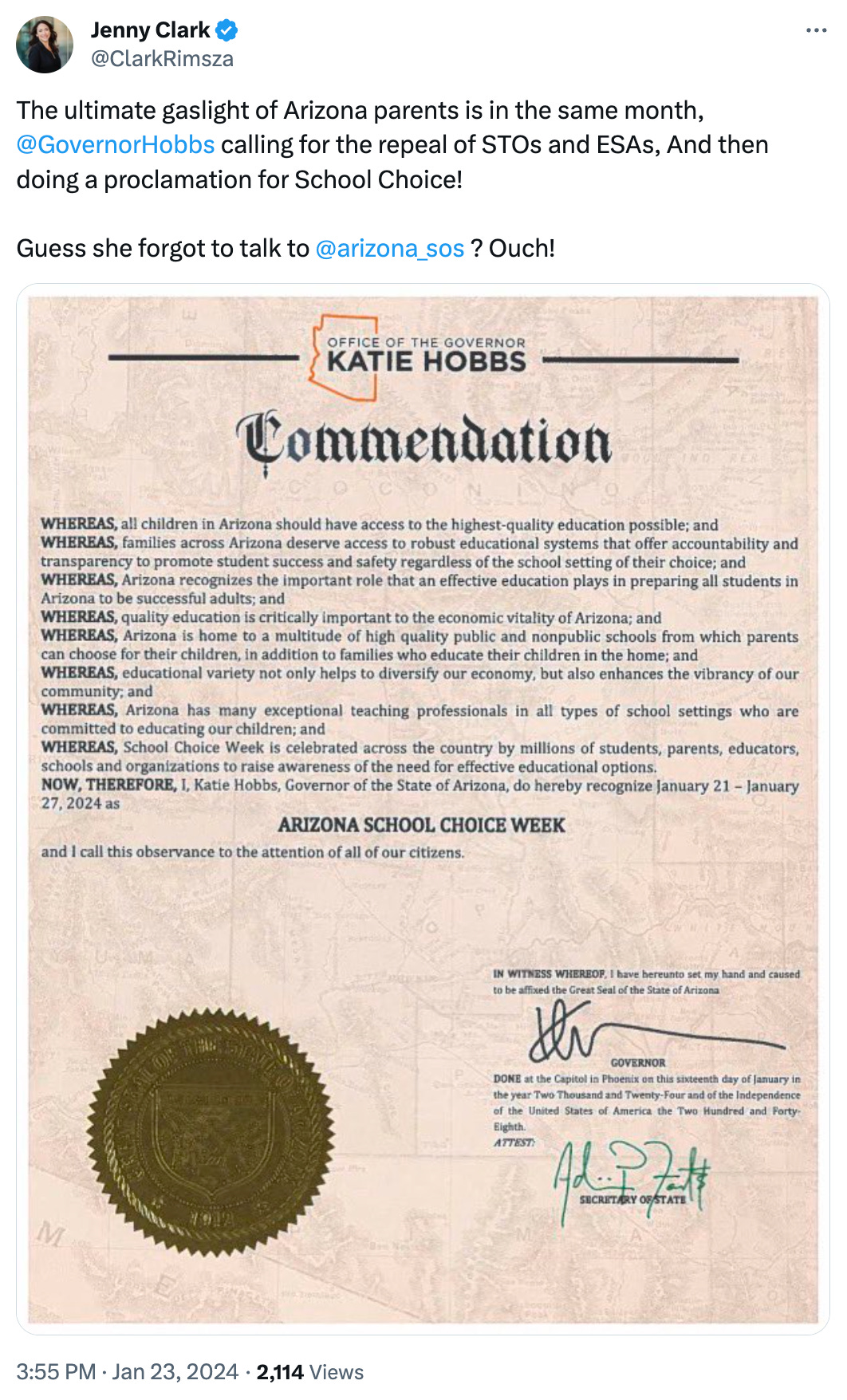 School voucher advocates were not pleased with Gov. Katie Hobbs’ proclamation declaring this week “school choice week” in Arizona.