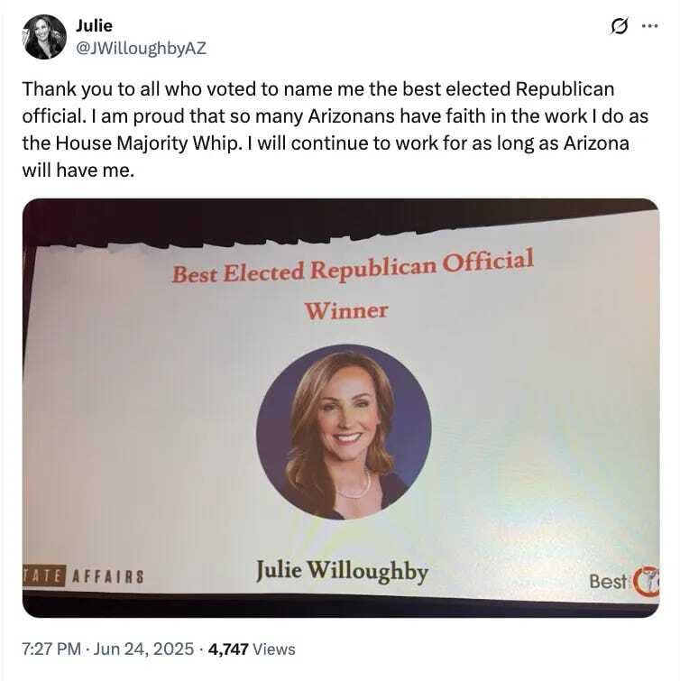 Awkward: Republican Sen. Vince Leach posted a meme on Facebook decrying the fact that there are 32 foreign-born members of Congress, the Arizona Mirror’s Jerod MacDonald-Evoy notes, including Republican U.S. Rep. Juan Ciscomani, who represents Leach in Congress. Not to mention that six of his colleagues in the state Legislature were born in another country, including House Speaker Steve Montenegro.