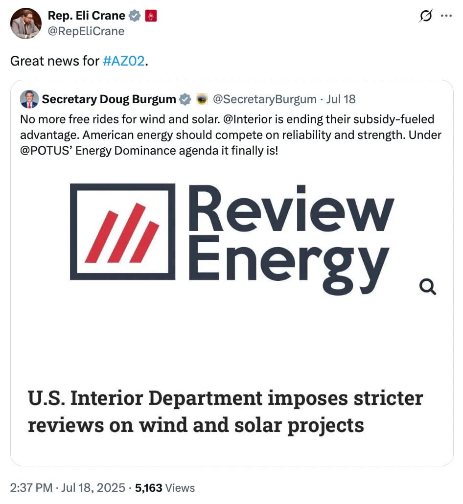 No solar for you: Among the folks not stoked about President Donald Trump’s “big beautiful” budget are Hopi leaders who were hoping to build community-scale and utility-scale solar to provide desperately needed electricity for tribal members, the Navajo-Hopi Observer’s Chez Oxendine reports. But those projects relied on clean energy grants and loan programs that were cut under Trump’s budget.