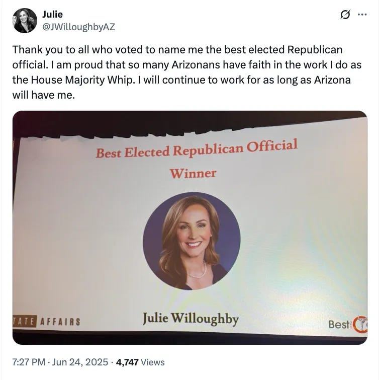 Millions not well spent: Karrin Taylor Robson outraised Republican U.S. Rep. Andy Biggs as the two prepare to square off in the 2026 GOP gubernatorial primary, Capitol scribe Howie Fischer reports based on the latest round of campaign finance reports. But that’s only because Robson loaned herself $2.2 million. Gov. Katie Hobbs pulled in the most actual donations in the reporting period, at $1.3 million, and has $4.7 million cash on hand, compared to Robson’s $876,000 war chest and Biggs’ $437,000.