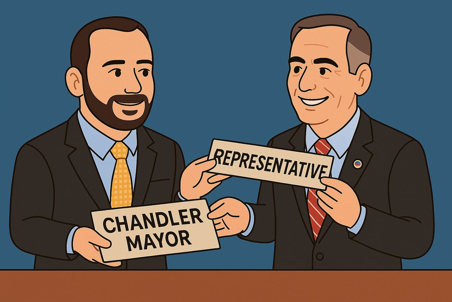 Our art intern, ChatGPT, thinks Mayor Kevin Hartke and Rep. Jeff Weninger can save some money by swapping name plates if they win their elections.At least part of the impetus for the seat-swapping is that Chandler has been going through a city charter crisis: Hartke's 2022 mayoral opponent filed a lawsuit against the city, claiming his two terms as mayor violate the charter’s term limits clause.