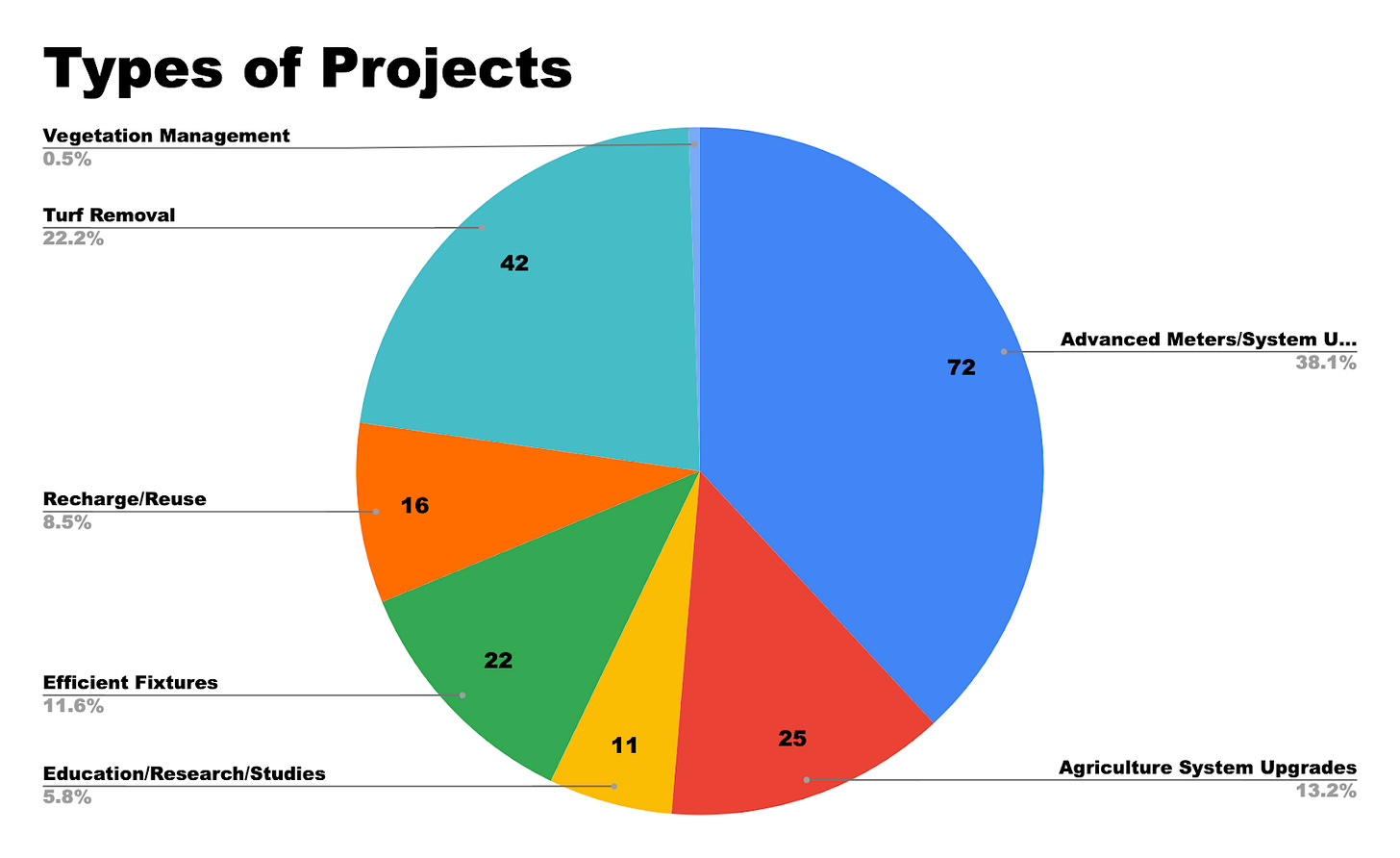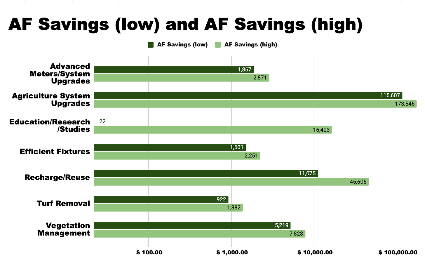 Each project was given a calculated estimate of the number of acre-feet of water it would save at a high and low range.3 Even though most of the projects are in “Advanced Meters/System Upgrades,” that category has an average acre-foot savings of 1,867 to 2,871 among 72 projects, far below the top category of 115,607 to 173,546 acre-feet for agriculture systems.