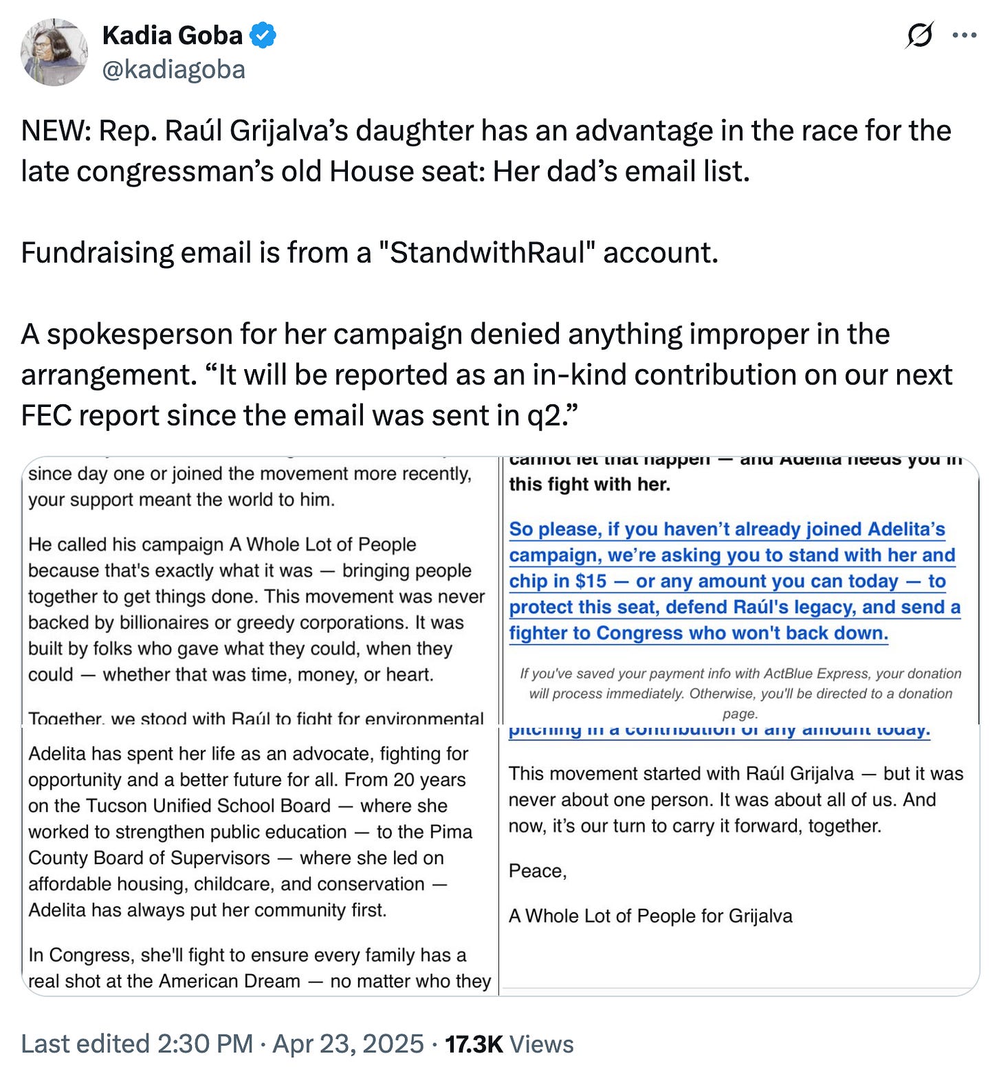 From beyond the grave, former U.S. Rep. Raul Grijalva just gave his daughter Adelita Grijalva a political parting gift — his prized fundraising email list, per Semafor.