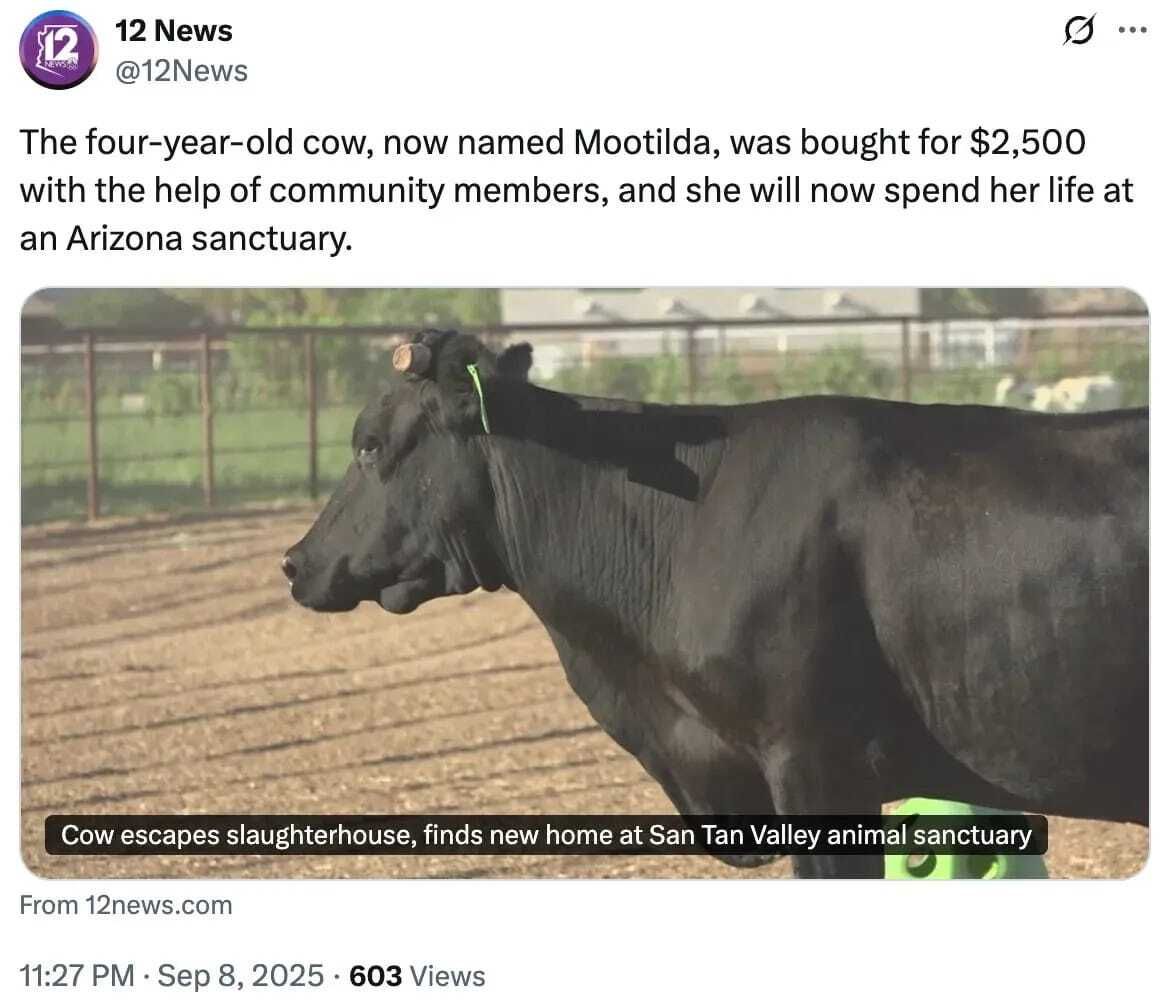 The owner was told she could buy the cow for $2,500 within the next 24 hours. Not knowing what to do, she turned to social media, where she raised enough money to bring Mootilda to her forever home, a sanctuary for traumatized animals.
