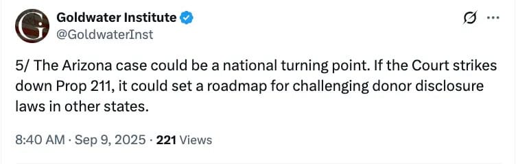 The core of Goldwater’s argument is that Prop 211 puts a “target on (donors’) backs” by outing their names and addresses, a move they say tramples constitutional rights to privacy and free speech.