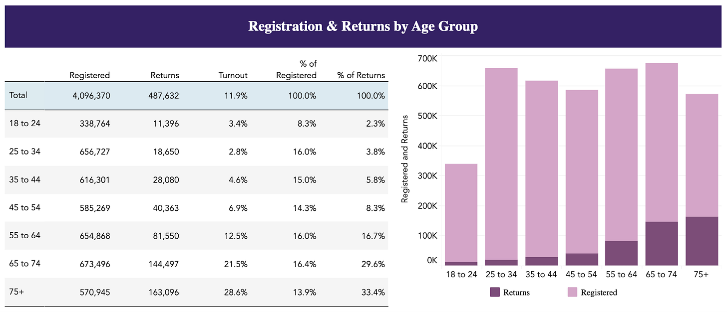 Voters over the age of 55 have returned about 80% of the ballots that election officials have received so far. Meaning people under the age of 55 have returned only 20% of the ballots in this election, even though they make up about half of all registered voters.