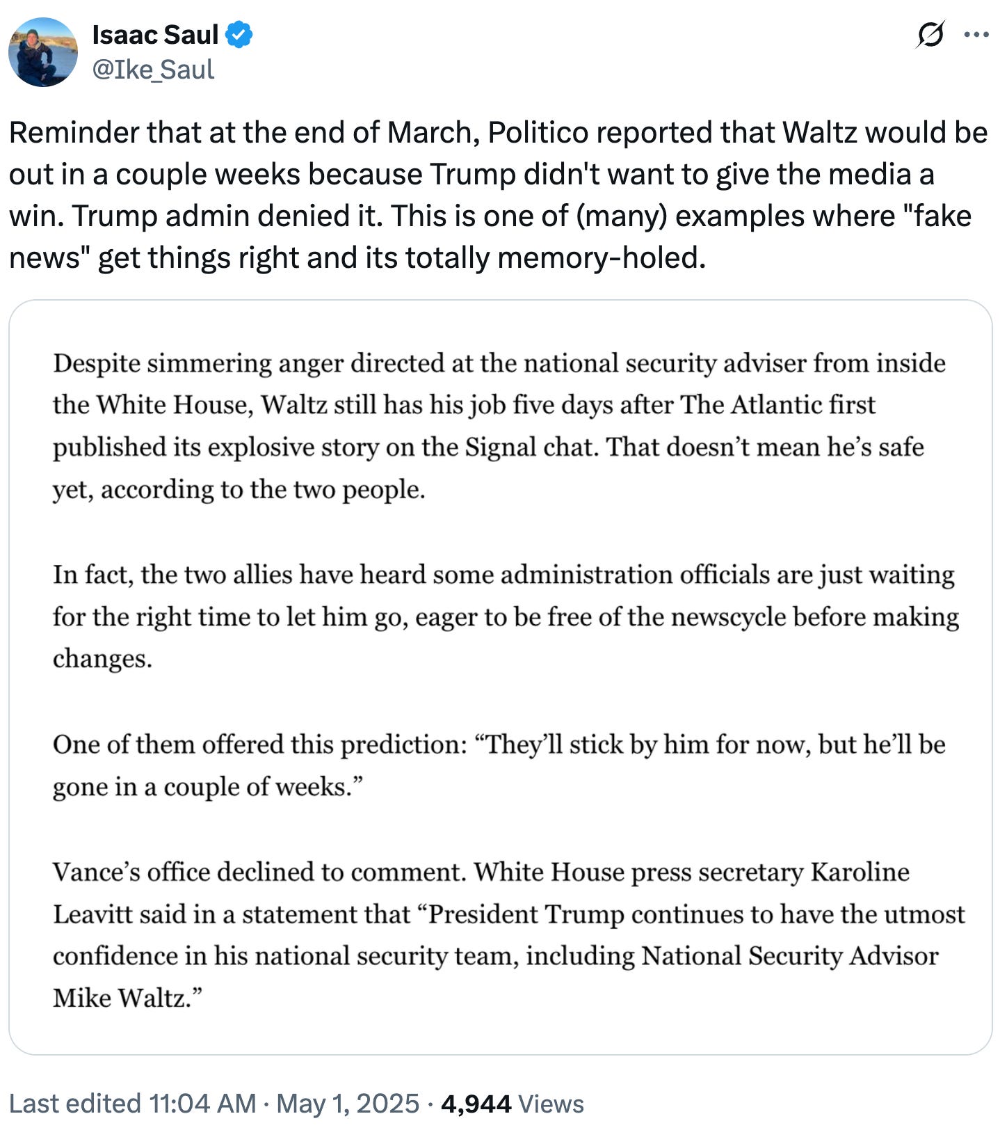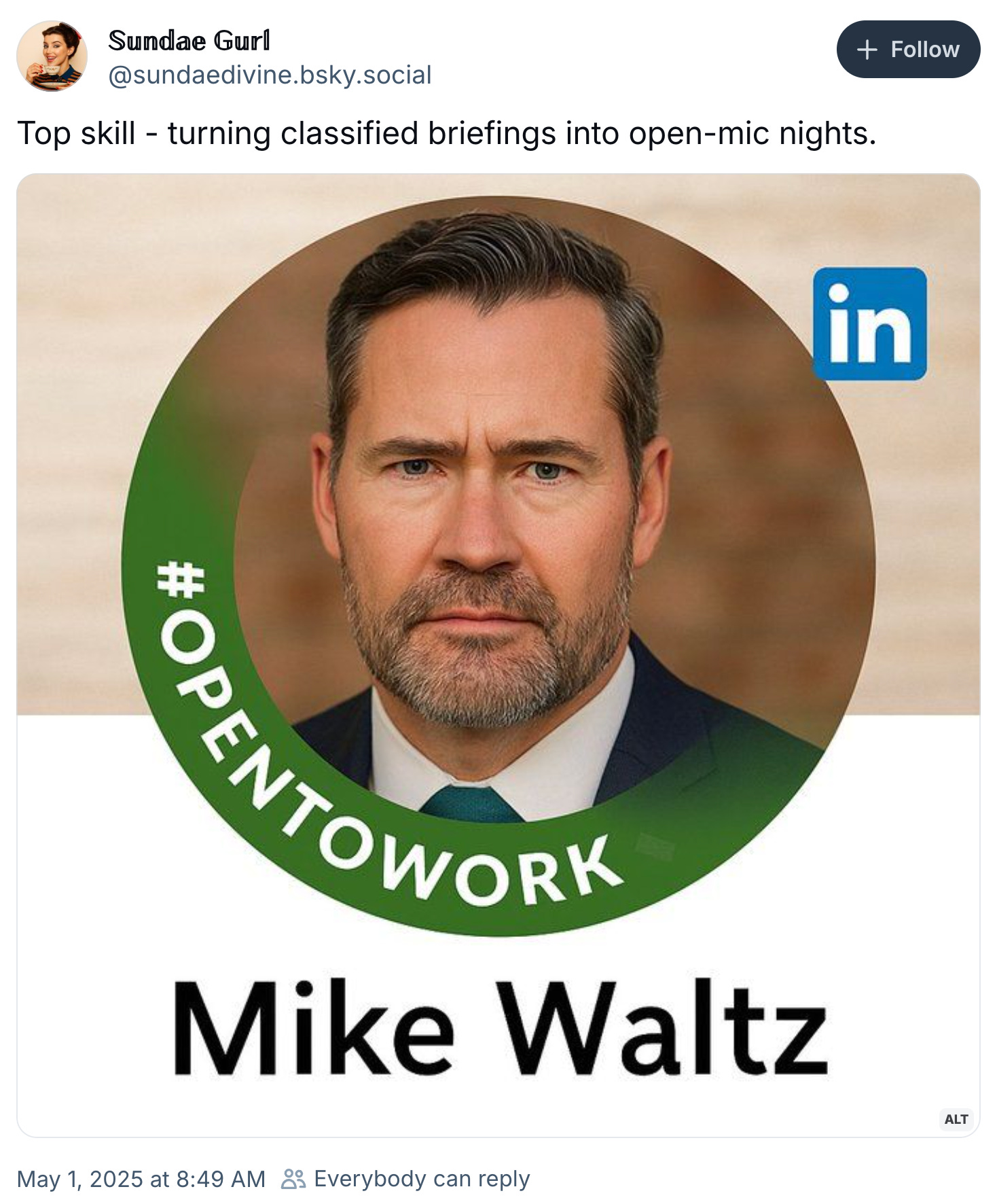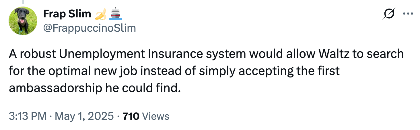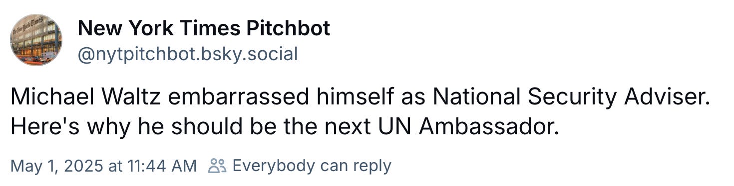 National Security Advisor Mike Waltz, of Signalgate fame, has failed upwards or at least vertically after President Donald Trump yeeted him yesterday and then announced he would nominate Waltz for the position of Ambassador to the United Nations instead.