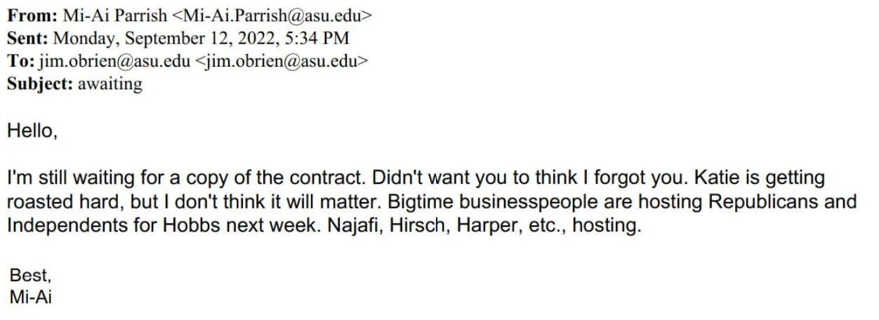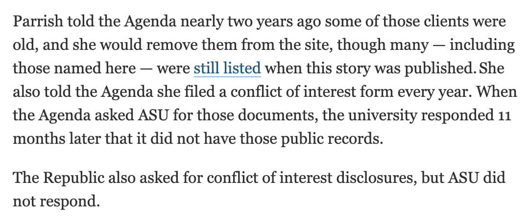 We bagged on ASU and AZPBS pretty hard back in 2022 for letting Crow break the rules to help Hobbs — and again in 2023, when we discovered station manager (and former Republic publisher) Mi-Ai Parrish’s flagrantly troublesome side hustle in political consulting. And the Republic’s piece yesterday credited the Agenda liberally.