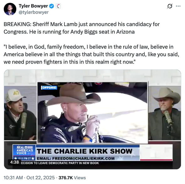 There’s an old sheriff in town: “60 Days In” star and “America’s Sheriff” Mark Lamb announced he will run for Andy Biggs’ congressional seat in the East Valley’s Congressional District 5, Noah Cullen reports for Pinal Central. Lamb, the former Pinal County sheriff, announced his candidacy on “The Charlie Kirk Show.” He has a history of supporting “America First” border security and has been a longtime supporter of President Donald Trump.