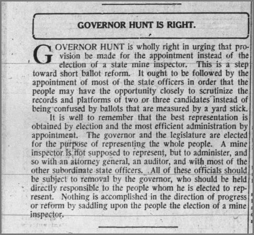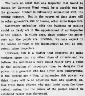 The debate over elected vs. appointed went on for “several days,” the legislative history says. Hunt wanted to appoint the mine inspector — governors generally do like more power.