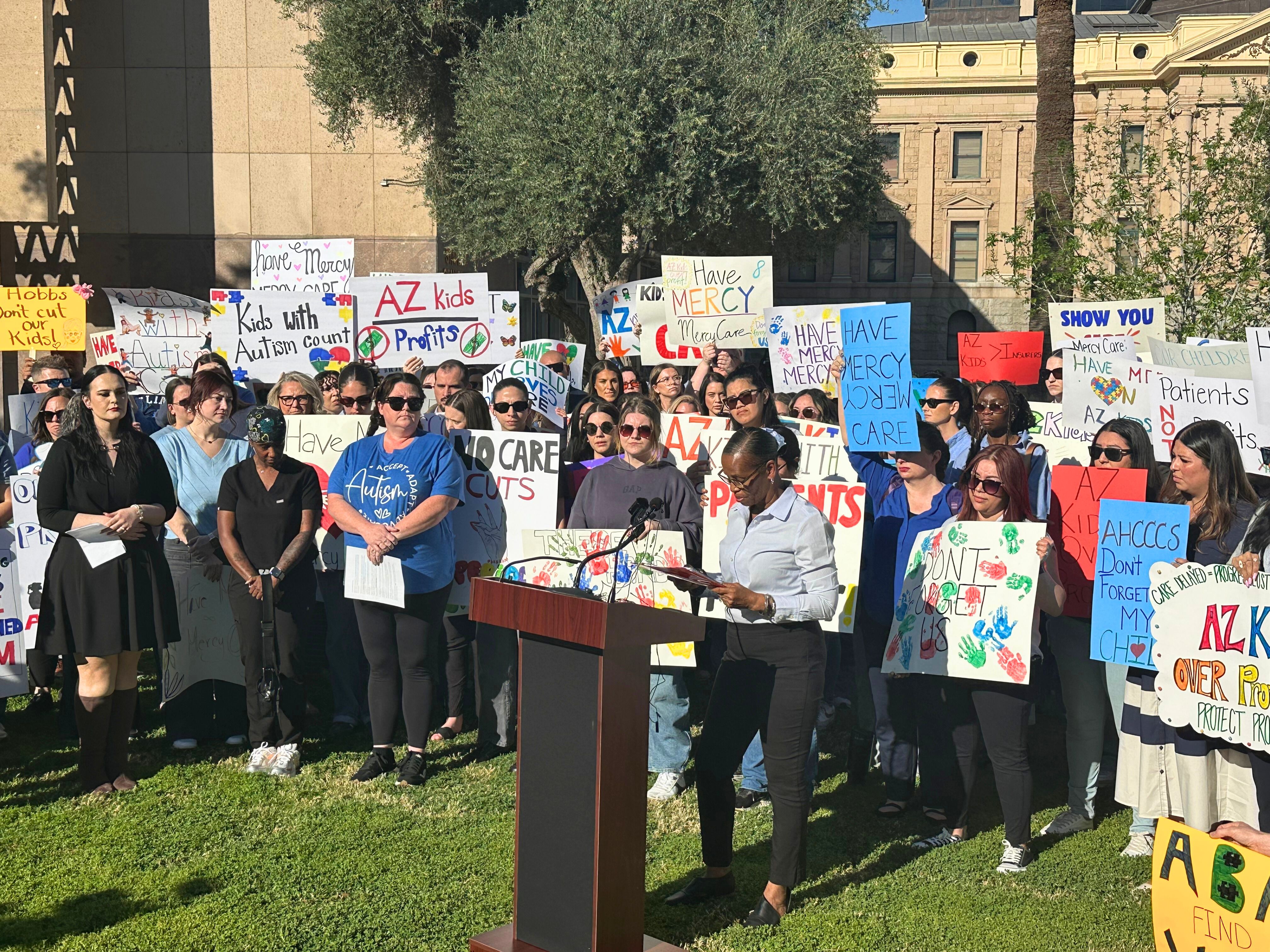 About 100 people gathered at the Arizona Capitol on Thursday to protest AHCCCS-contracted insurers dropping hundreds of children from autism therapy coverage. Several mothers said losing ABA therapy could seriously harm their children’s development.