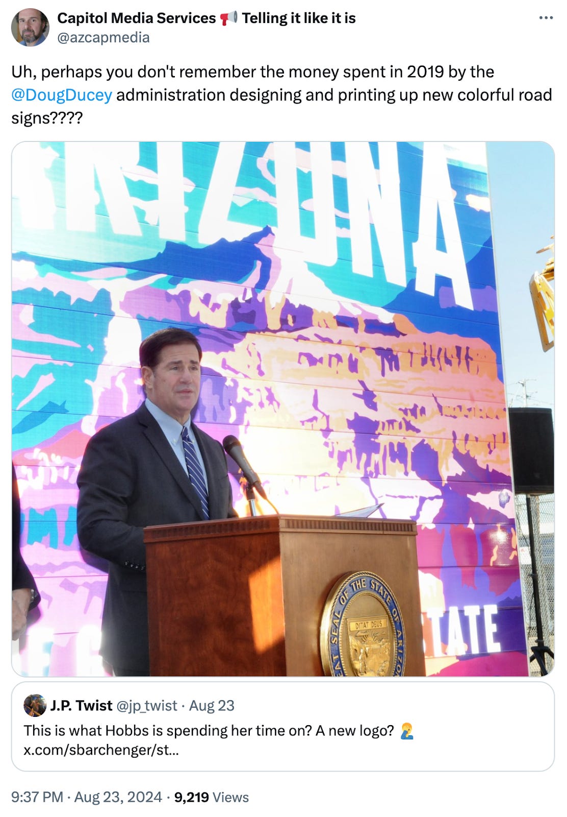 How much did that logo cost?: It took Arizona a year to draft up a new branding logo, which Gov. Katie Hobbs unveiled last week, the Arizona Mirror’s Shondiin Silversmith writes. The consulting firm who helped come up with it says the logo represents Arizona’s diverse culture and they hope that “every Arizonan can look at this new brand and see a piece of themselves in there.”