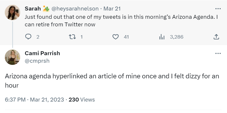 And inevitably, we had to ban our first commenter from our website after they took things a little too far. Yep… It was former Superintendent of Public Instruction John Huppenthal. Good guess. Also, Kari Lake tweeted a screenshot of one of our newsletters, so we briefly worried that we would qualify as “real news” in her book. But then her goons kicked Hank out of another event, so that made us feel better.