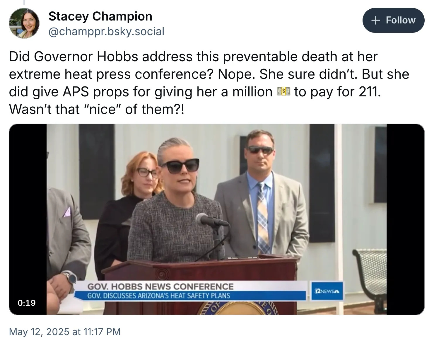Donations get results part 2: Hobbs also signed another bill that APS wrote and lobbied for that allows utilities to sell off debt as bonds. Environmentalists, Democratic lawmakers and Attorney General Kris Mayes all urged her not to sign it and warned it’s probably unconstitutional, per the Capitol Times’ Reagan Priest.