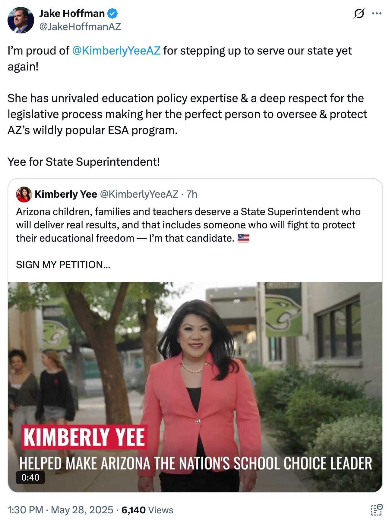 Yesterday, Hoffman introduced his newest Freedom-Caucus-backed candidate: Arizona Treasurer Kimberly Yee.