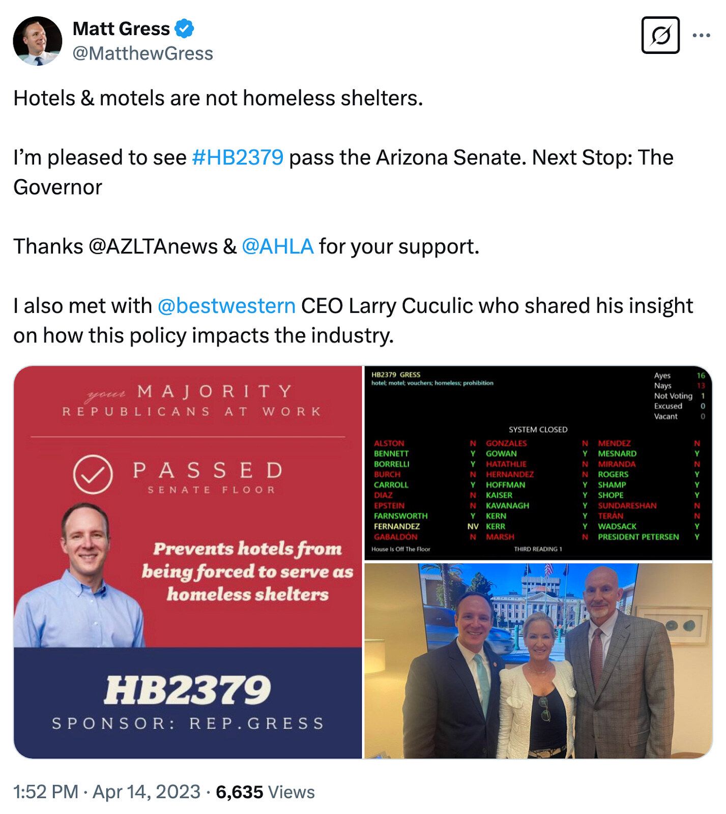 The Republican majority’s bills are faring much better — specifically homelessness-related bills from Republican Rep. Matt Gress to make hotels put up signs disclosing if homeless people are staying there and increasing penalties for using drugs in a shelter.