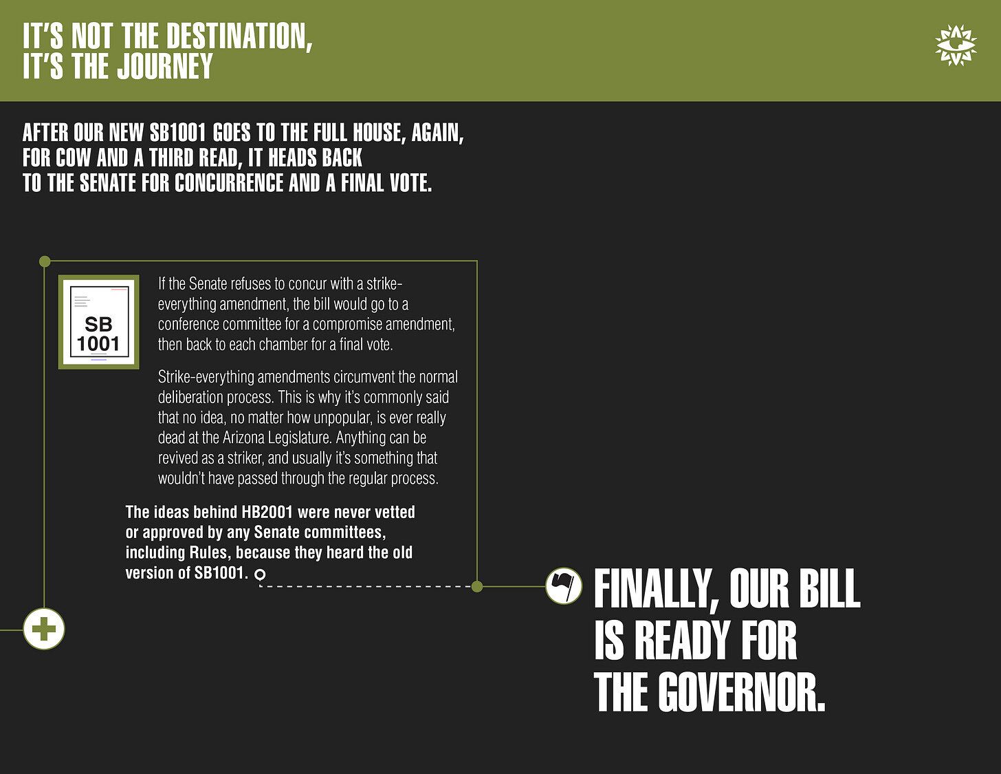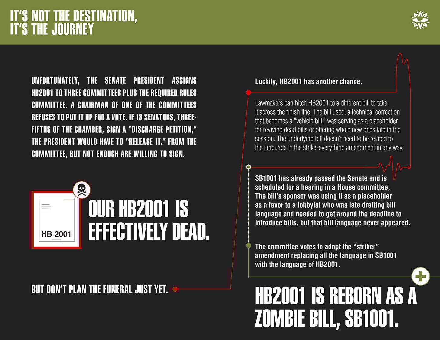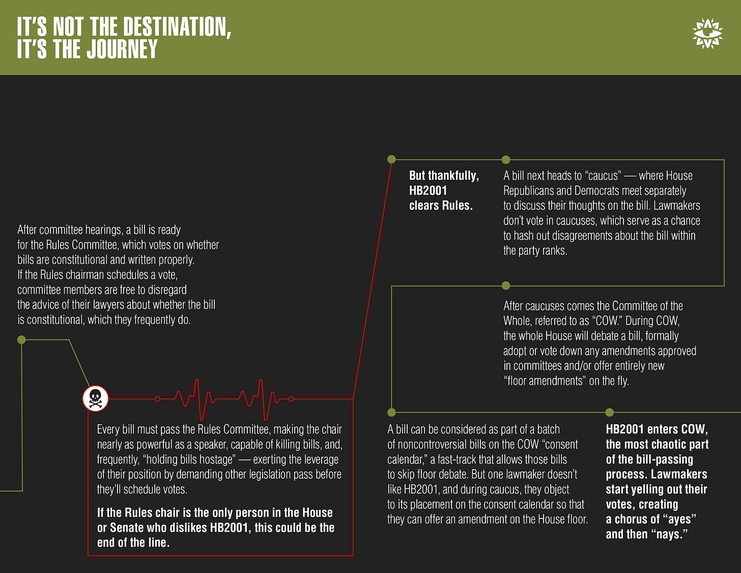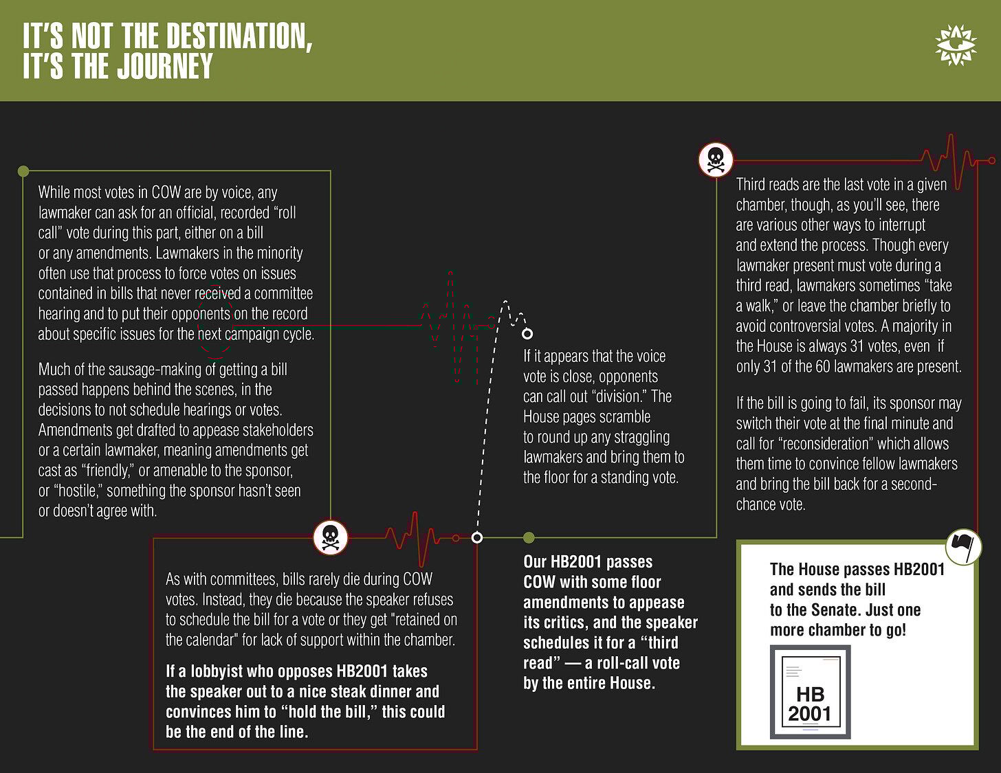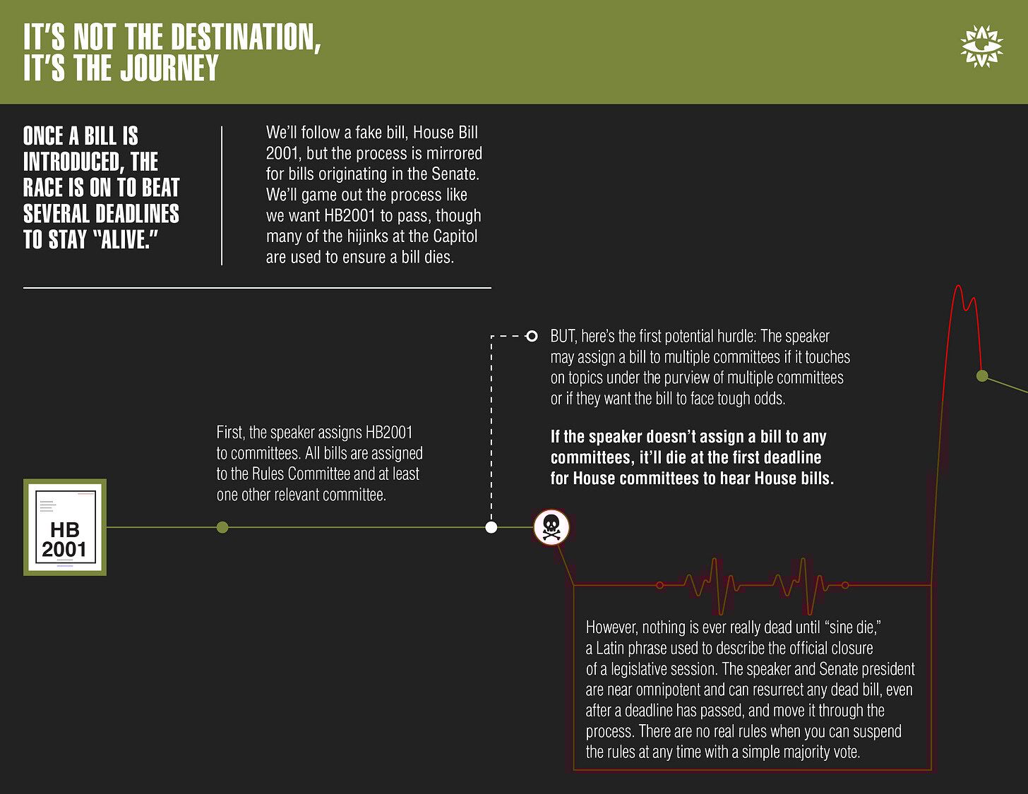 But the pamphlet leaves a lot out. We wanted to refresh that venerable cartoon to offer a more detailed, behind-the-scenes look at how the legislative process really works.