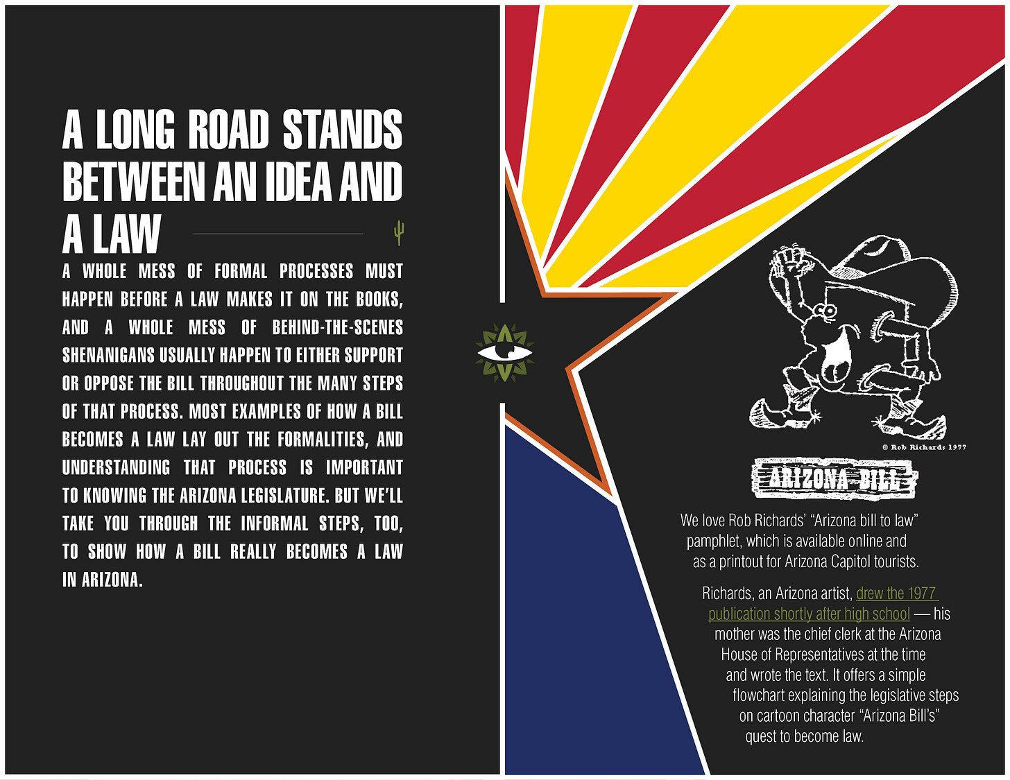 Richards, an Arizona artist, drew the 1977 publication shortly after high school. His mother Jane was the chief clerk at the Arizona House of Representatives at the time and she wrote the text. It offers a simple flowchart explaining the legislative steps on “Arizona Bill’s” quest to become a law.