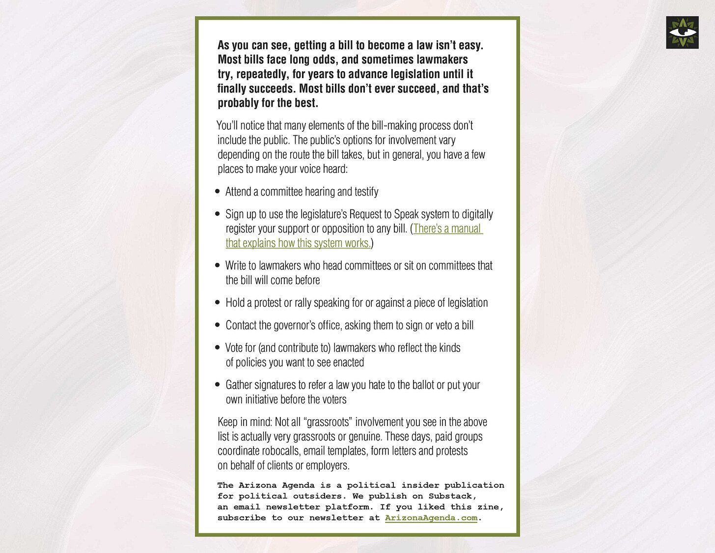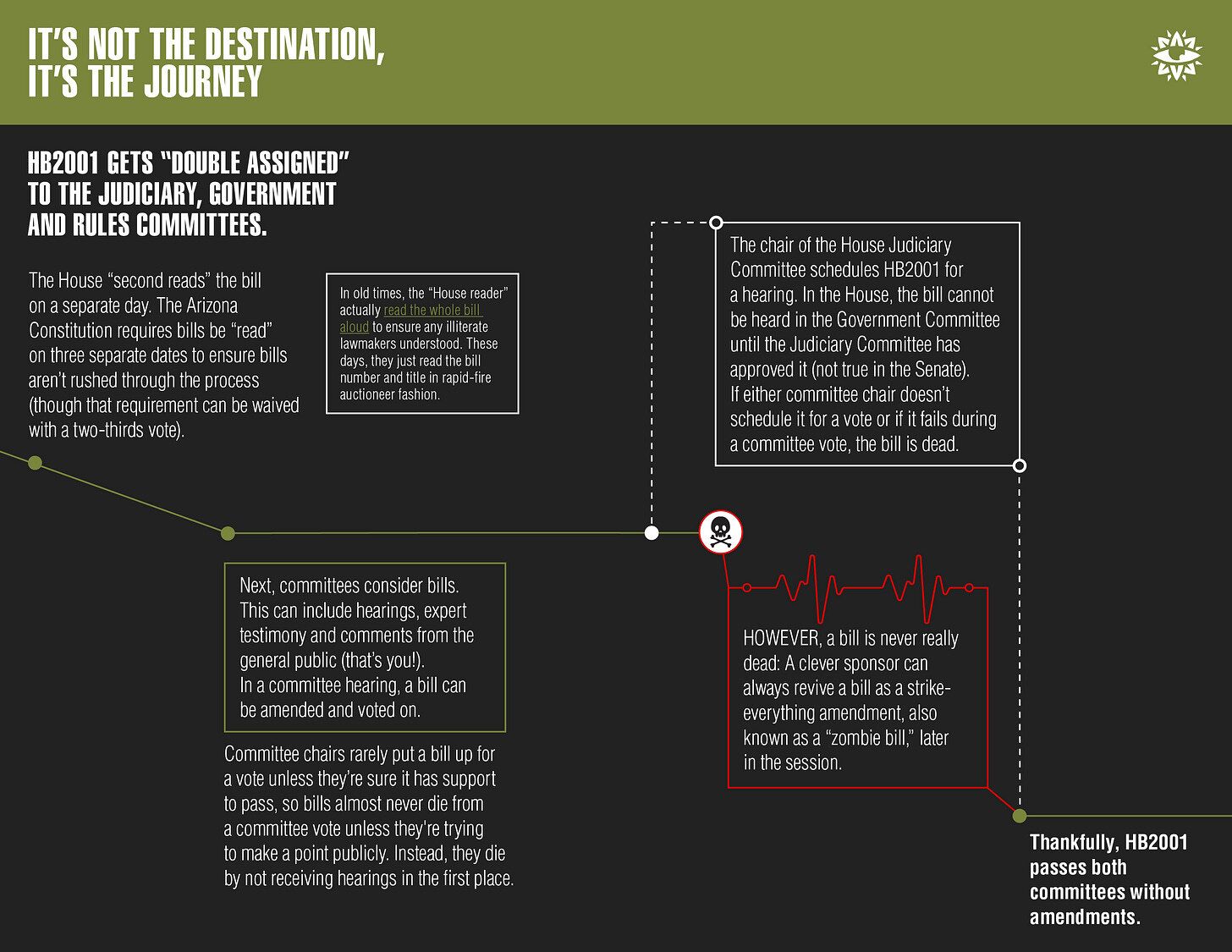 Our Bill to Law zine1 fills in the gaps, explaining the shenanigans behind each step of the legislative process, and how lobbyists, lawmakers and others can game the system to reach a desired outcome.