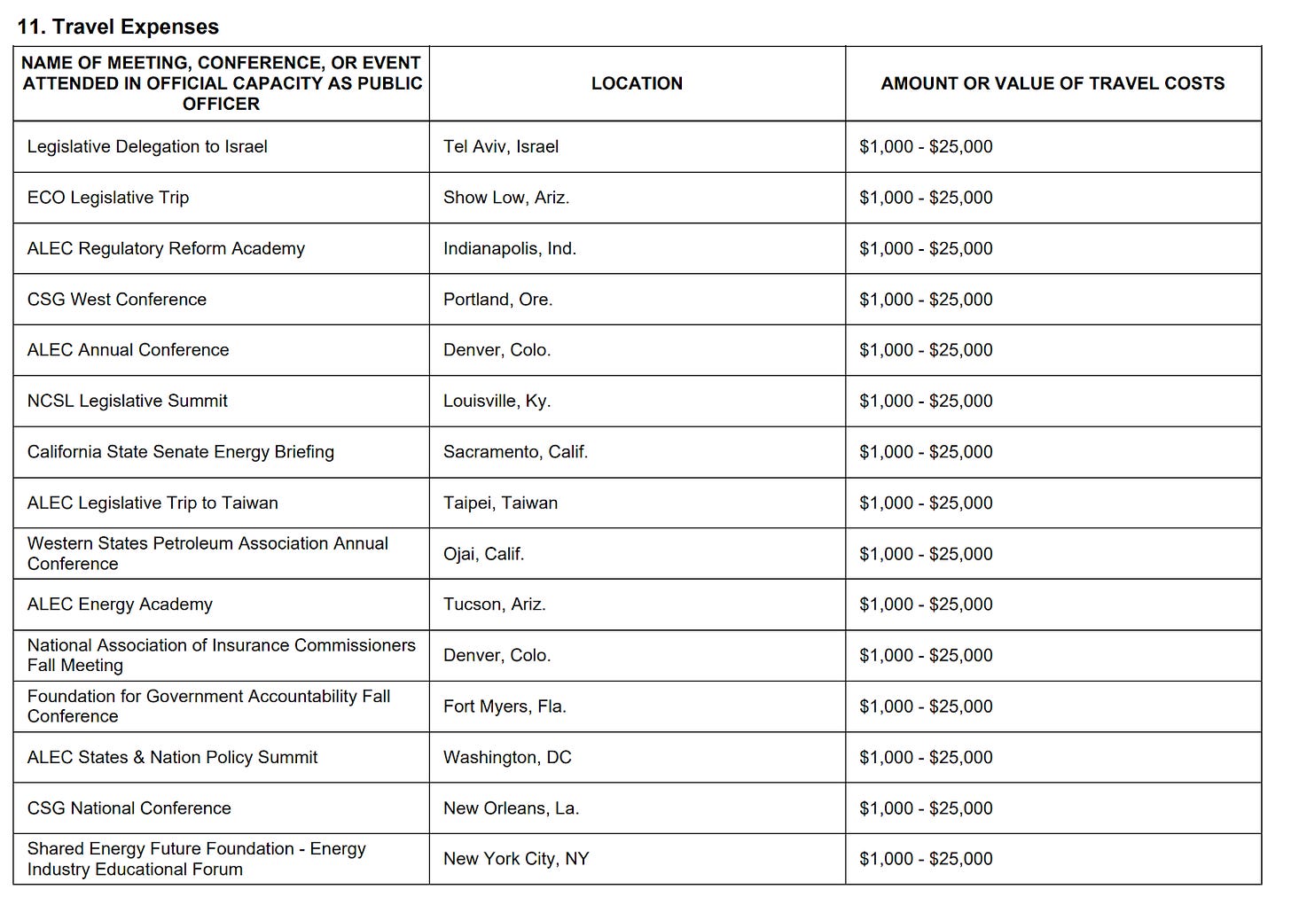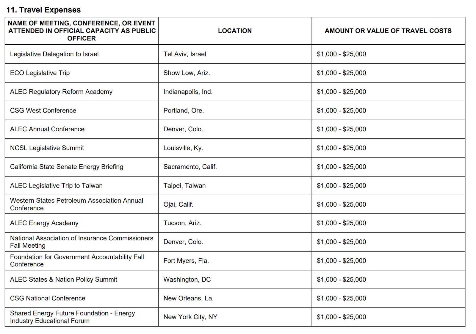 Rep. Justin Wilmeth drove up that total, however, by taking 15 trips to places like Taiwan and Portland, Oregon.