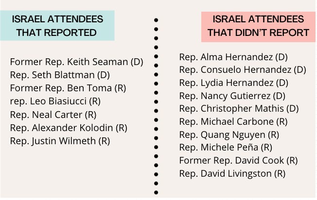 Democrat Rep. Alma Hernandez, a staunch Israel supporter who organized the trip, posted several pictures from Israel online. Yet, the only trip she reported last year was a conference in Denver.