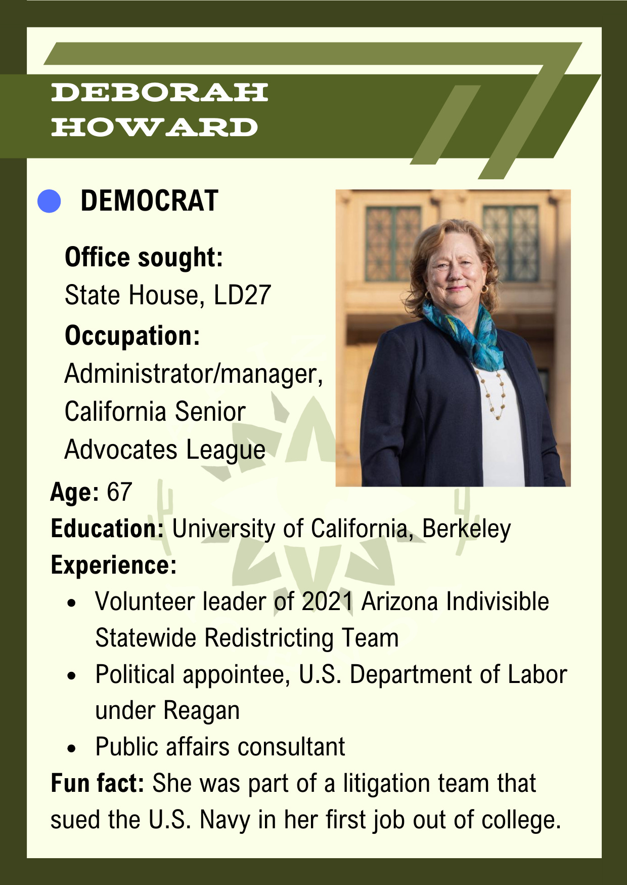 Small typo at the end of Deborah Howard card: "fist job" -> "first job"