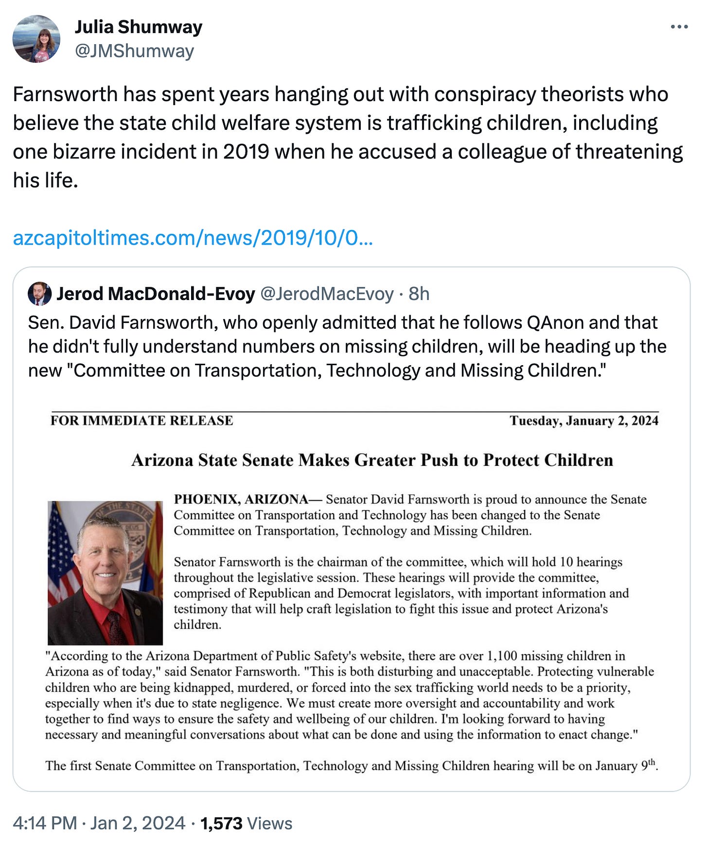 The Arizona Senate announced yesterday that it was changing the name of Republican Sen. David Farnsworth’s “Transportation and Technology Committee” to the “Transportation, Technology and Missing Children Committee.”