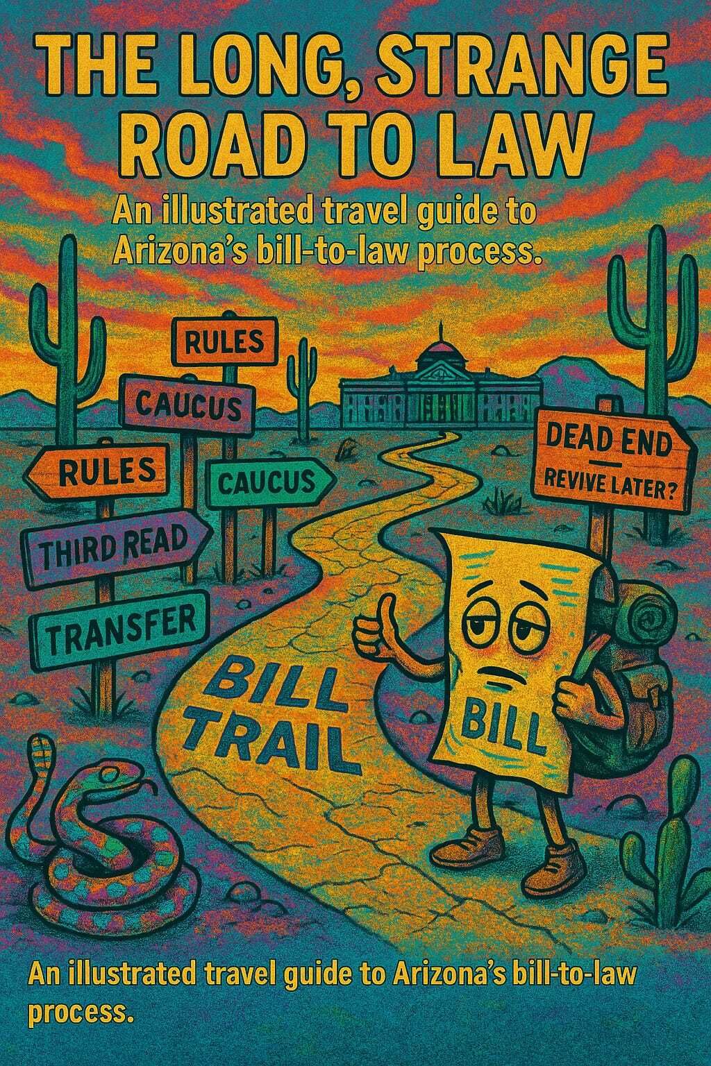 The Long, Strange Road to Law is our trippy little travelogue through the Arizona bill process — from its humble beginnings as an idea, to the procedural gauntlet it must survive, to its final showdown at the governor’s desk.