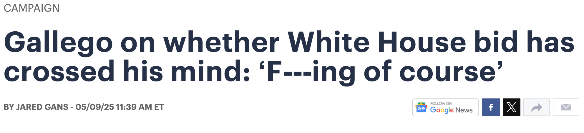Give a mouse a cookie: Democratic U.S. Sen. Ruben Gallego’s recent trip to Pennsylvania has the national outlets speculating about his potential future run for the presidency. Gallego told the Washington Post it’s not something he’s thinking about “right now” since he has a toddler. Meanwhile, he’s still on the fence about the crypto-backed stablecoin bill, lashing out at Republicans who tried “to f‑‑‑ us” by not amending it, per The Hill.