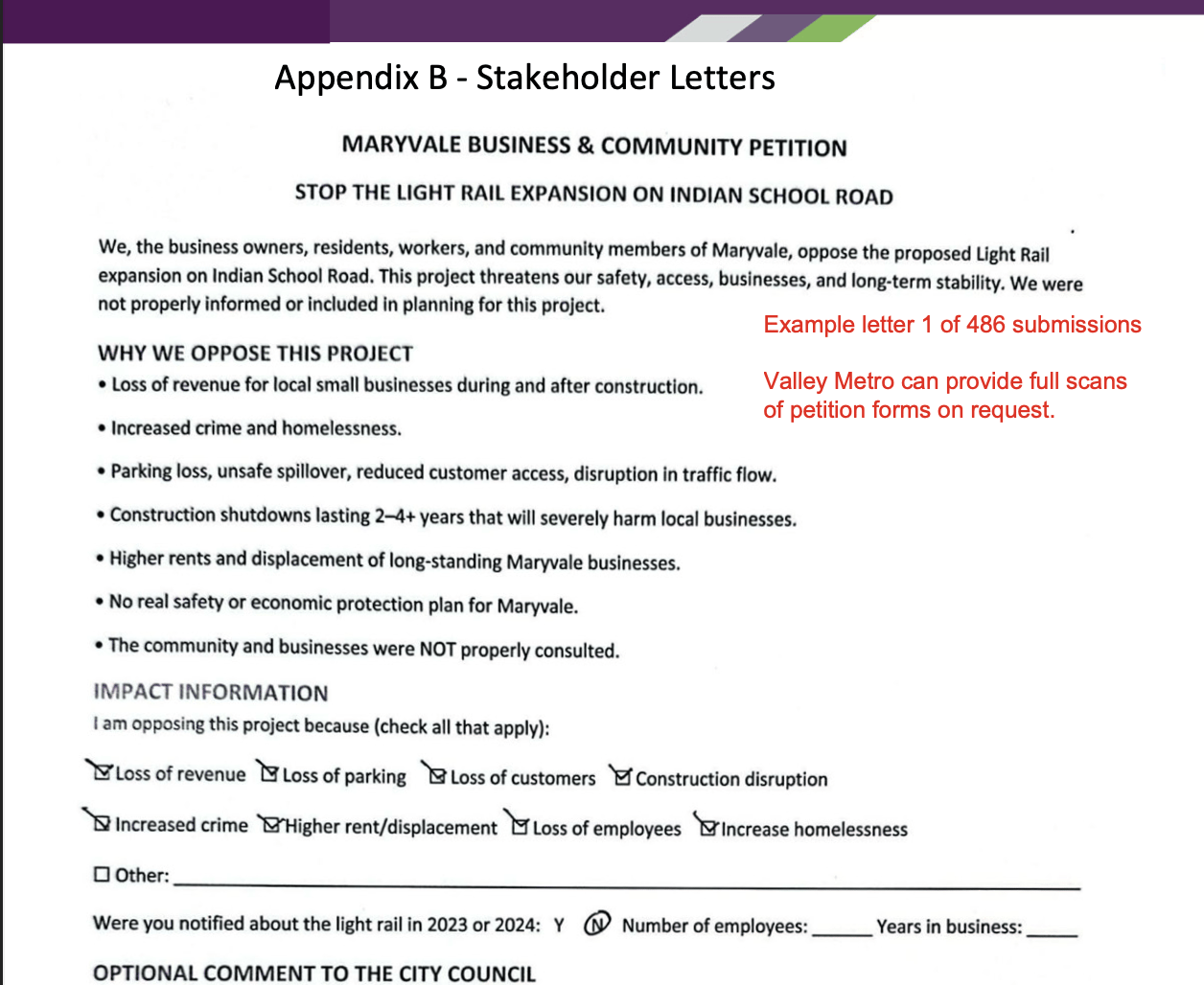 As for the potential Indian School route, there is plenty of concern from those who would be immediately affected by it — making it a potentially sticky political decision. At least 486 business owners and residents along Indian School Road have added their names to a petition urging the council not to consider the route.
