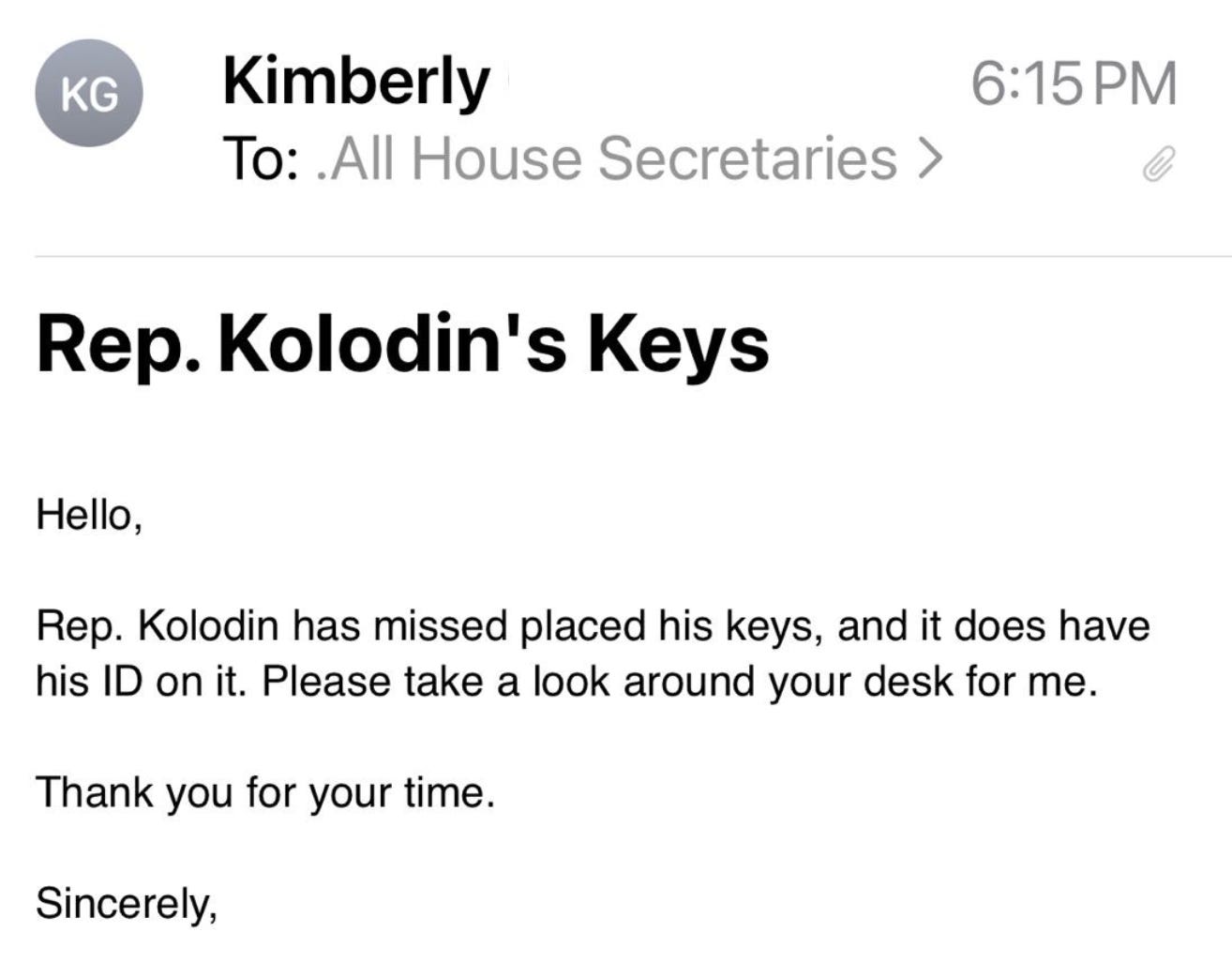 The House of Representatives is once again asking for your help in finding Republican Rep. Alexander Kolodin’s keys.