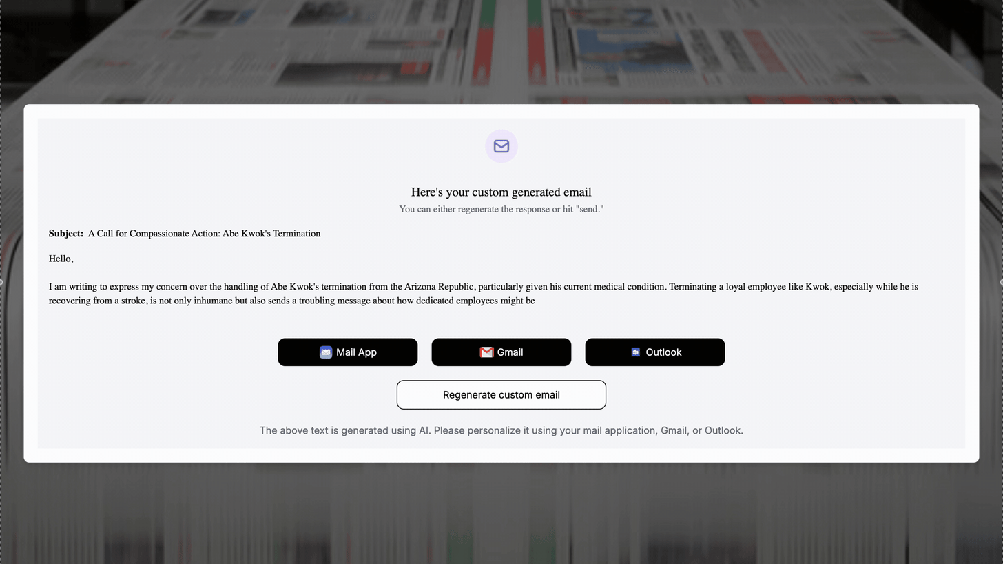 We used our grassroots advocacy tool, Wolfpack, to spin up a letter-writing campaign to Gannett CEO Mike Reed advocating for Kwok.