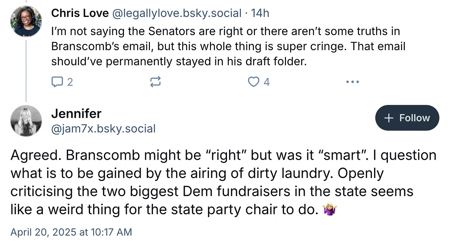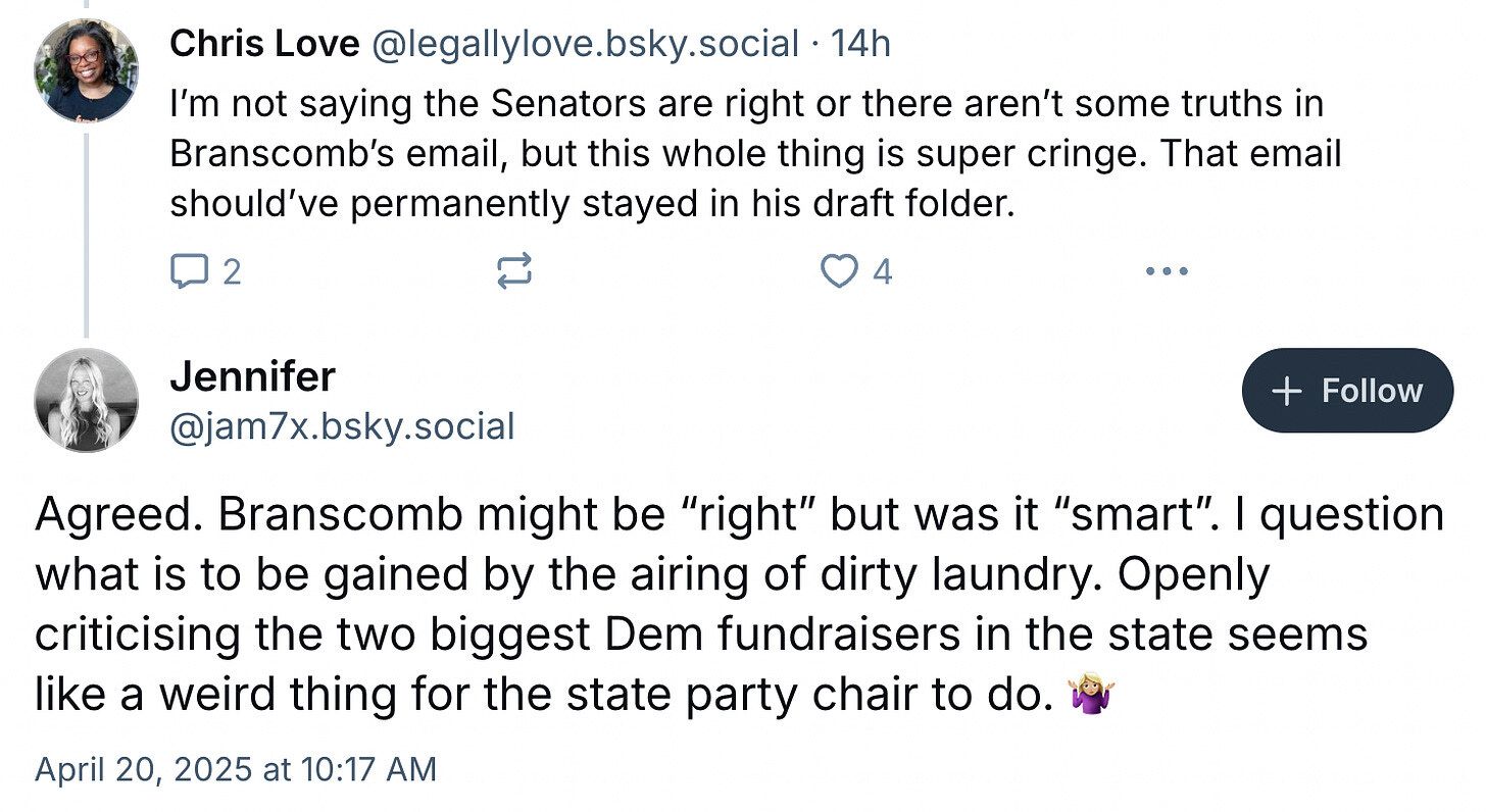 “He emphasized his role in raising funds for the party and implied that I should be grateful, even beholden, to him for the party's financial resources. I found this sentiment troubling, as it undermined the independent leadership you elected me to bring,” Branscomb wrote.