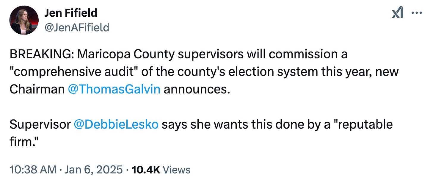 All bets on the septuagenarian: Fontes said the Secretary of State’s Office is in “desperate need of updating some systems,” like election night reporting and the voter information database. Fontes told KTAR’s Mike Broomhead the election night reporting tool is an in-house system that only one 70-year-old man knows how to work. Meanwhile, incoming Sen. Mark Finchem told some of his new Prescott constituents he’s dropping his demand that Arizona hand-count ballots, but he wants machine tabulators to have “Department of Defense-level cybersecurity standards” even though they’re not connected to the internet, per Capitol scribe Howie Fischer.