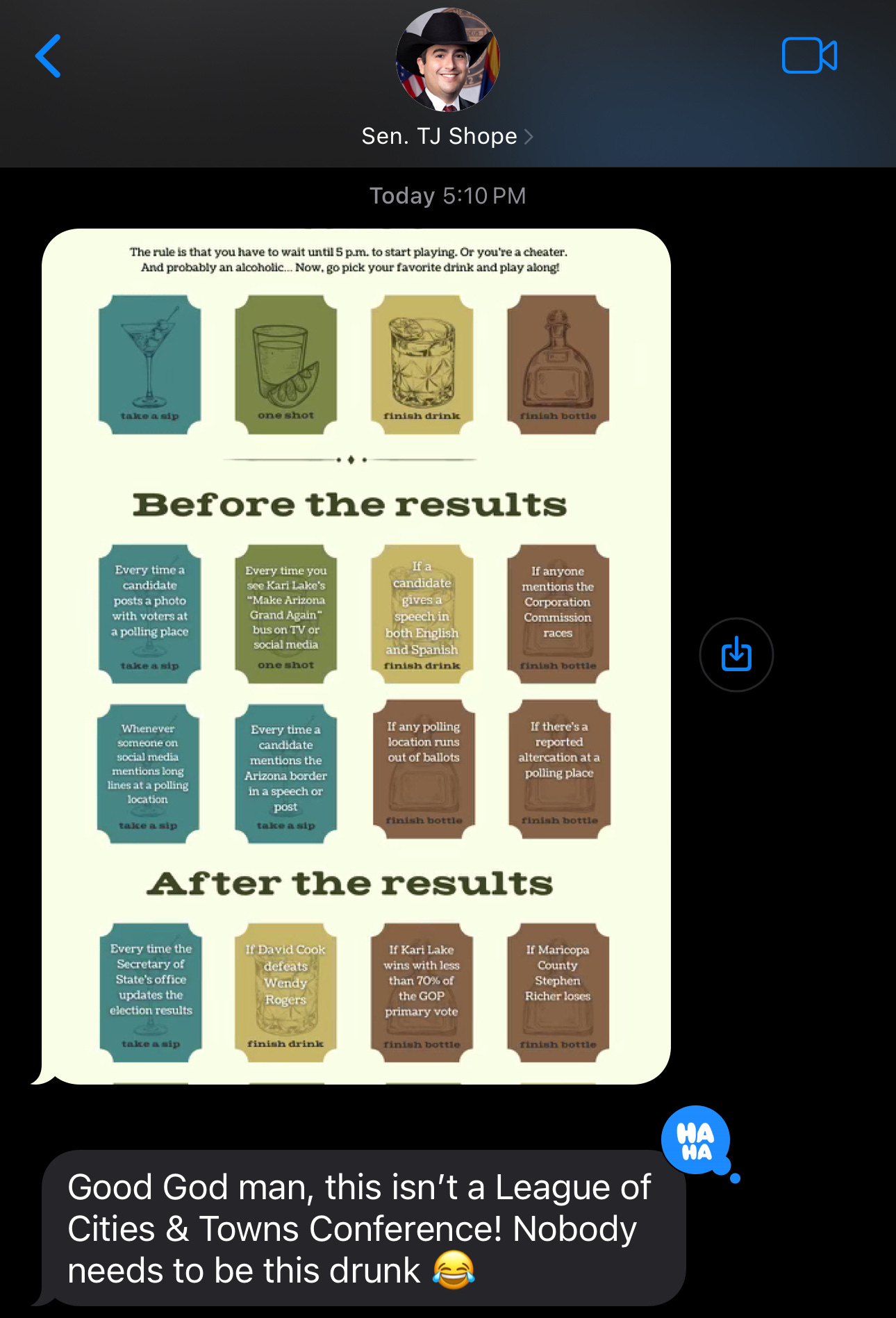 CD8 Republicans: Abe Hamadeh quickly pulled ahead of Blake Masters, and he held that solid lead throughout the night. House Speaker Ben Toma was nipping at Masters’ heels, while Republican Sen. Anthony Kern took home a deplorable 5% of the vote, far less than disgraced former Congressman Trent Franks, who earned 17% of the vote.