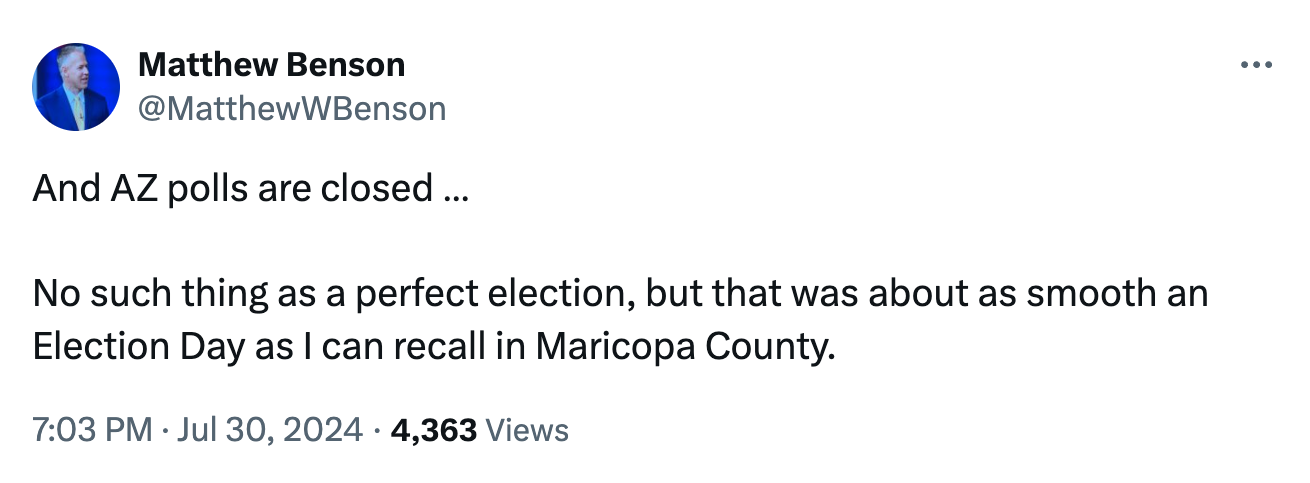 Slow day: Voter turnout on election day was sparse in Maricopa and Pima counties, the Republic’s Sasha Hupka reported. Maricopa County officials said they expected turnout would end up being far below the 2022 primary, while Pima County officials reported 24,000 election-day voters, down from 27,000 two years ago.