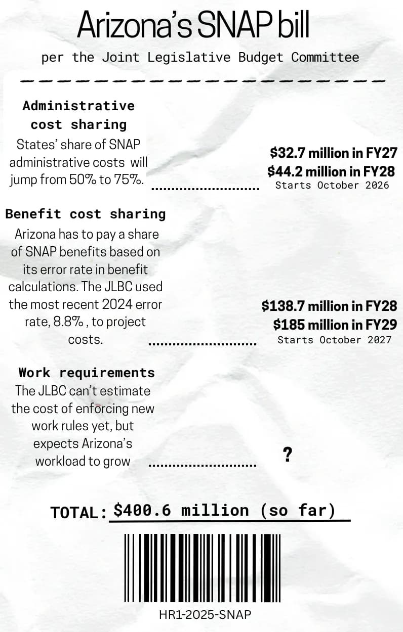 The Joint Legislative Budget Committee, the legislature’s financial experts, estimated federal SNAP cost-shifts to states will cost Arizona $215.6 million through fiscal year 2028. They have yet to publish numbers for how much more the state will have to pay for implementing new work requirements.