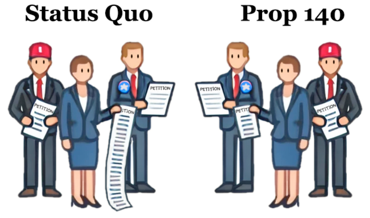 Prop 140 requires all candidates for the same office to collect the same number of signatures from voters to qualify, regardless of the candidates’ party affiliation.